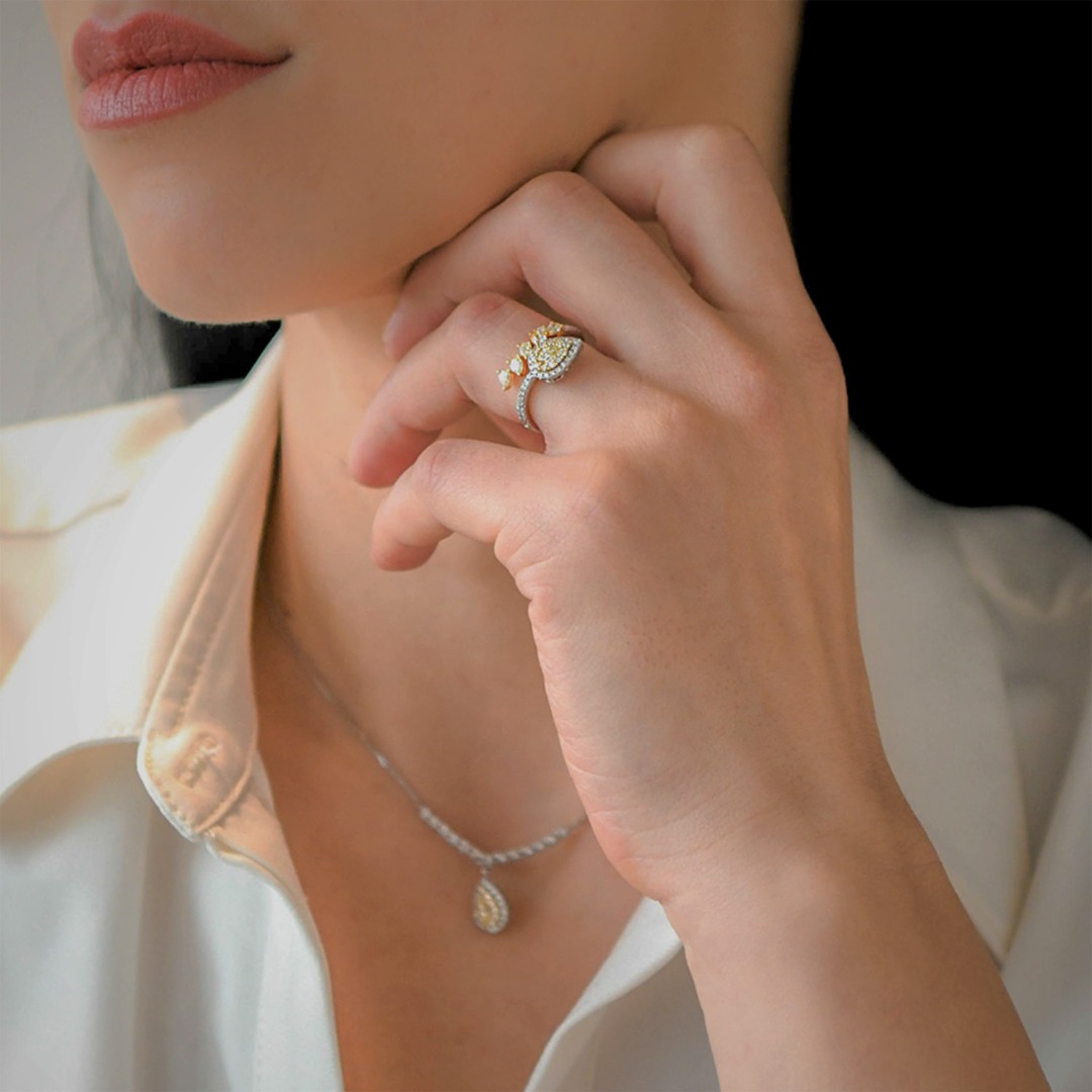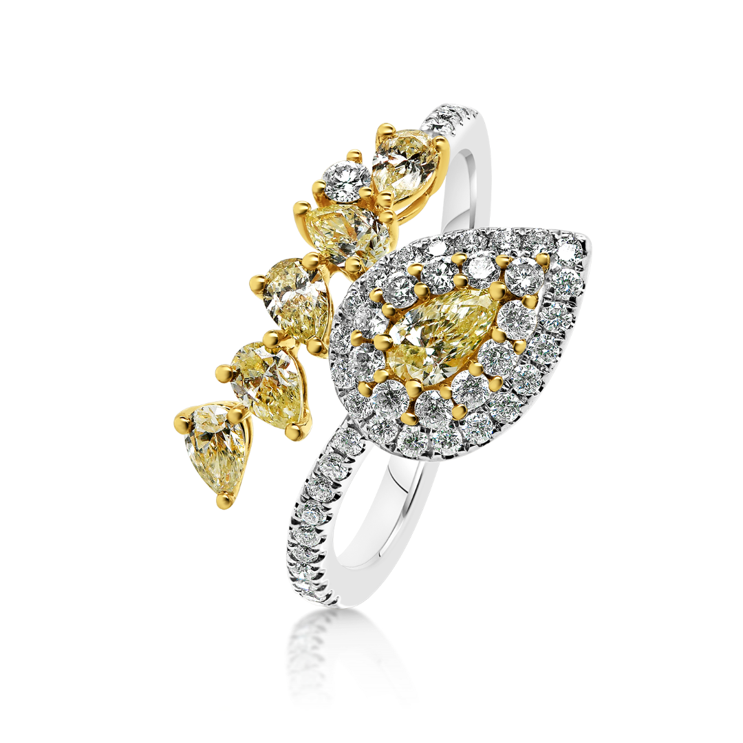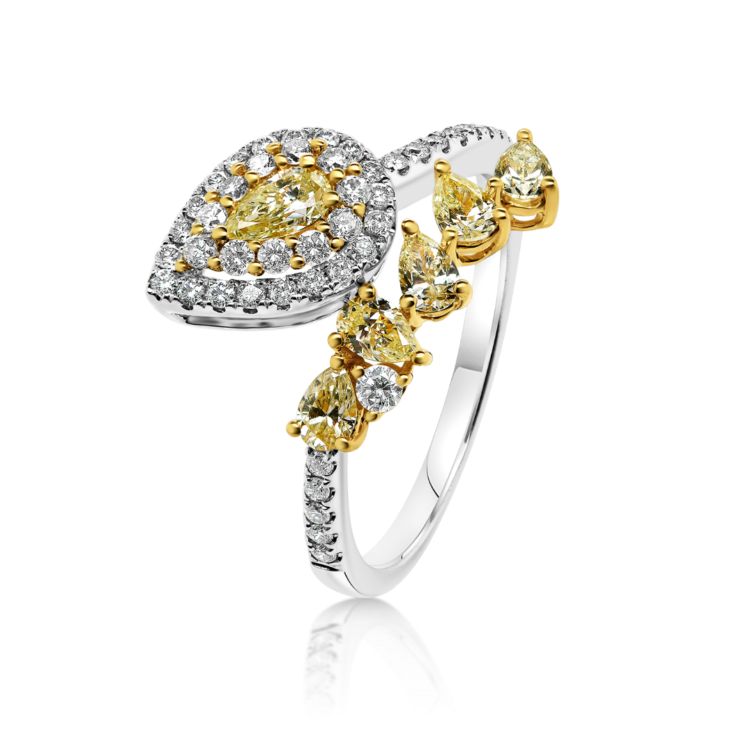 Inel din aur alb de 18K, încrustat cu 47 de Diamante Brilliant cut de 0.379ct și 6 Diamante galbene Pear cut de 0.590ct.