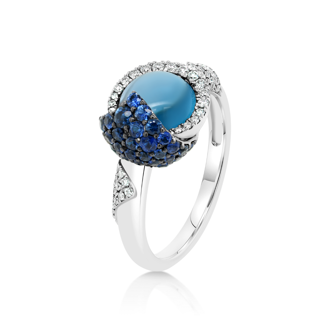 Inel din aur alb de 18K cu Diamante naturale, Topaz și Safire.