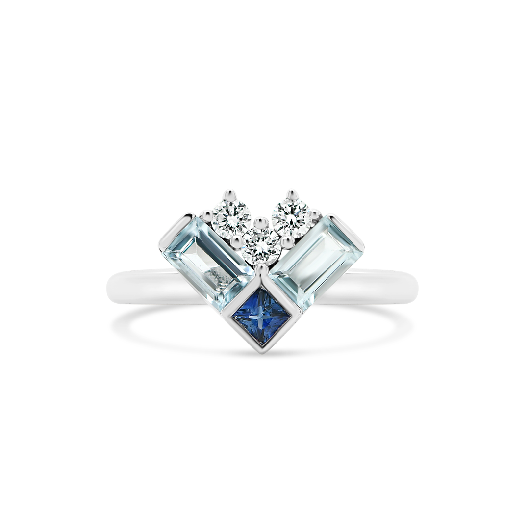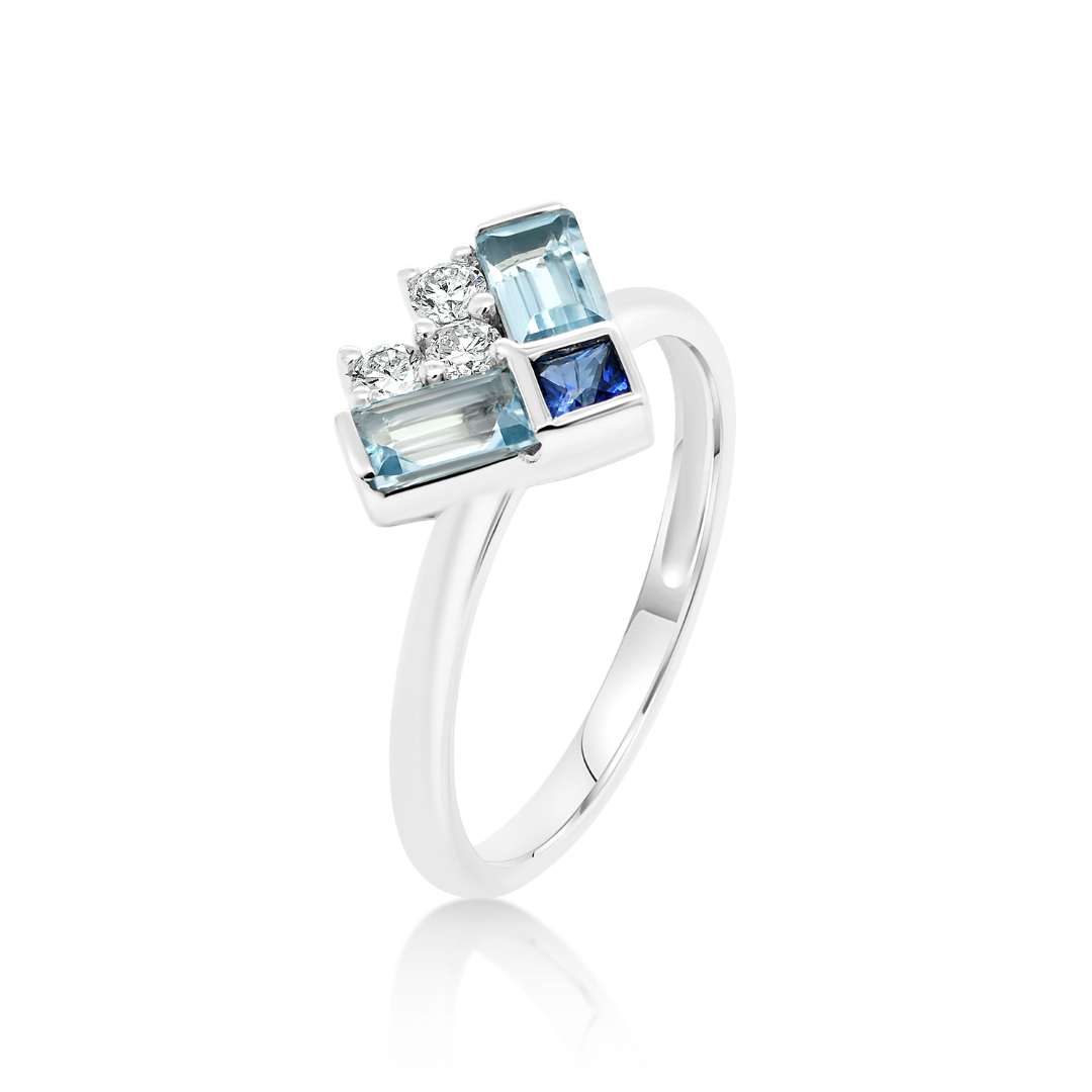 Inel din aur alb de 18K cu 3 Diamante Round Brilliant de 0.152ct, un Safir albastru de 0.108ct și două pietre Blue Topaz de 0.70ct.