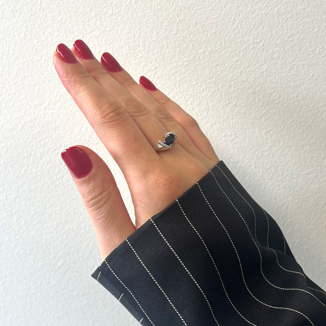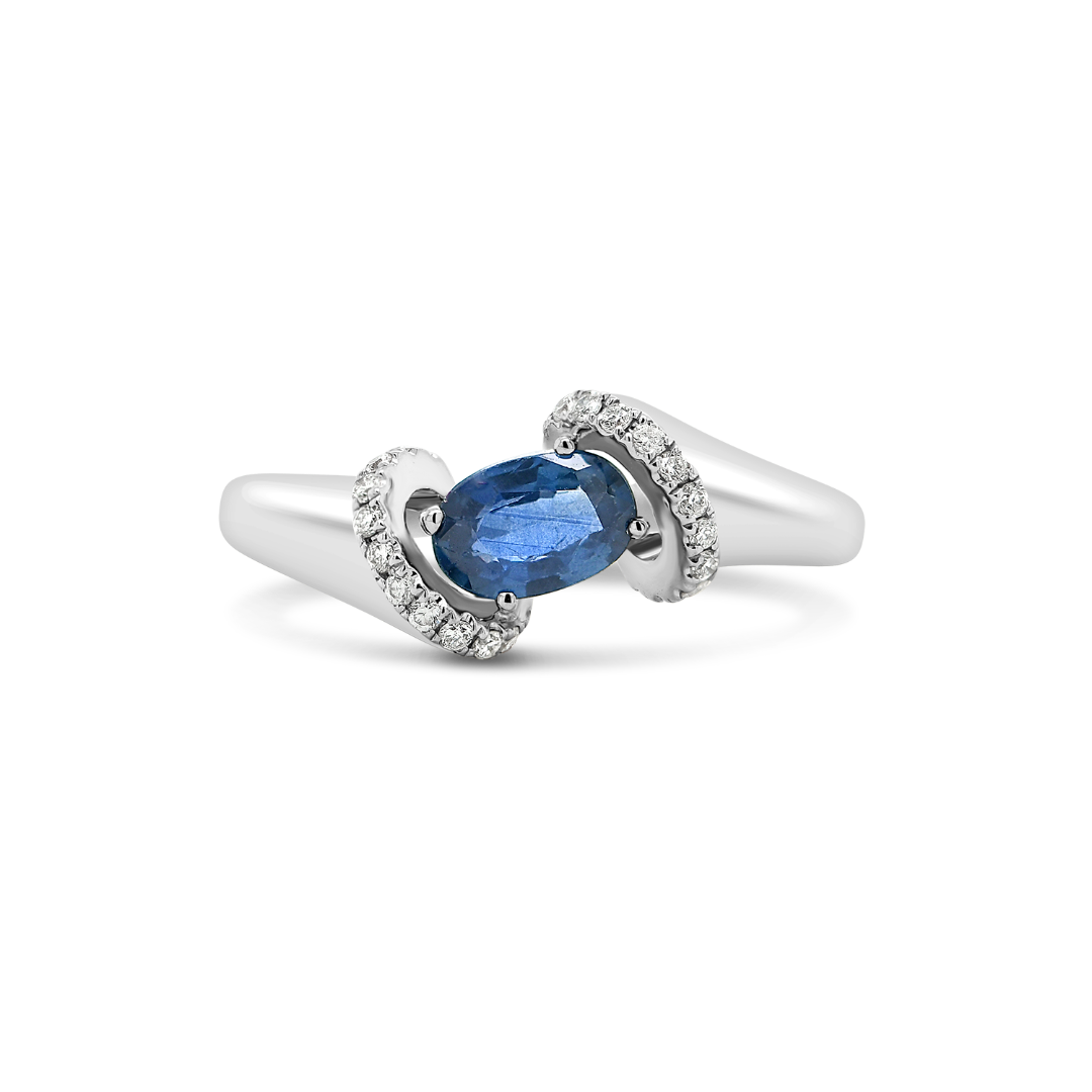 Inel din aur alb de 18K, cu 24 de Diamante Round Brilliant de 0.121ct și un Safir albastru de 0.69ct.