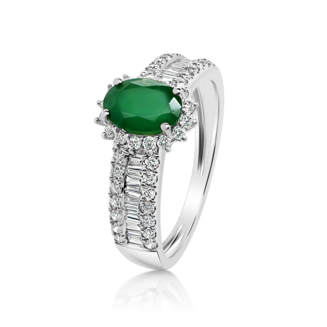 Inel din aur alb de 18K cu 44 de Diamante Brilliant cut de 0.299ct, Diamante Baguette de 0.142ct şi un Smarald de 0.79ct.