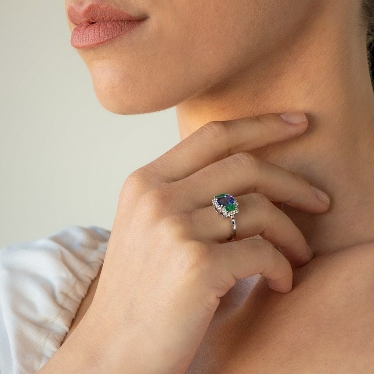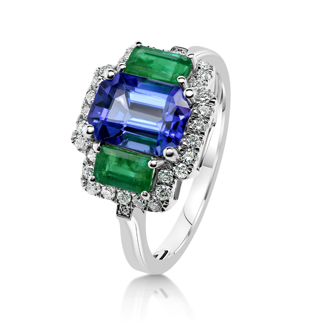 Inel din aur alb de 18K cu Diamante, Smaralde și Tanzanit