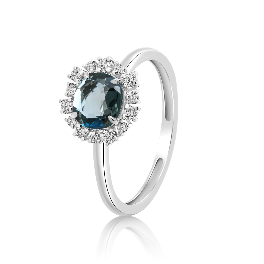 Inel din aur alb de 18K cu un London Blue Topaz și 10 Diamante Round Brilliant.