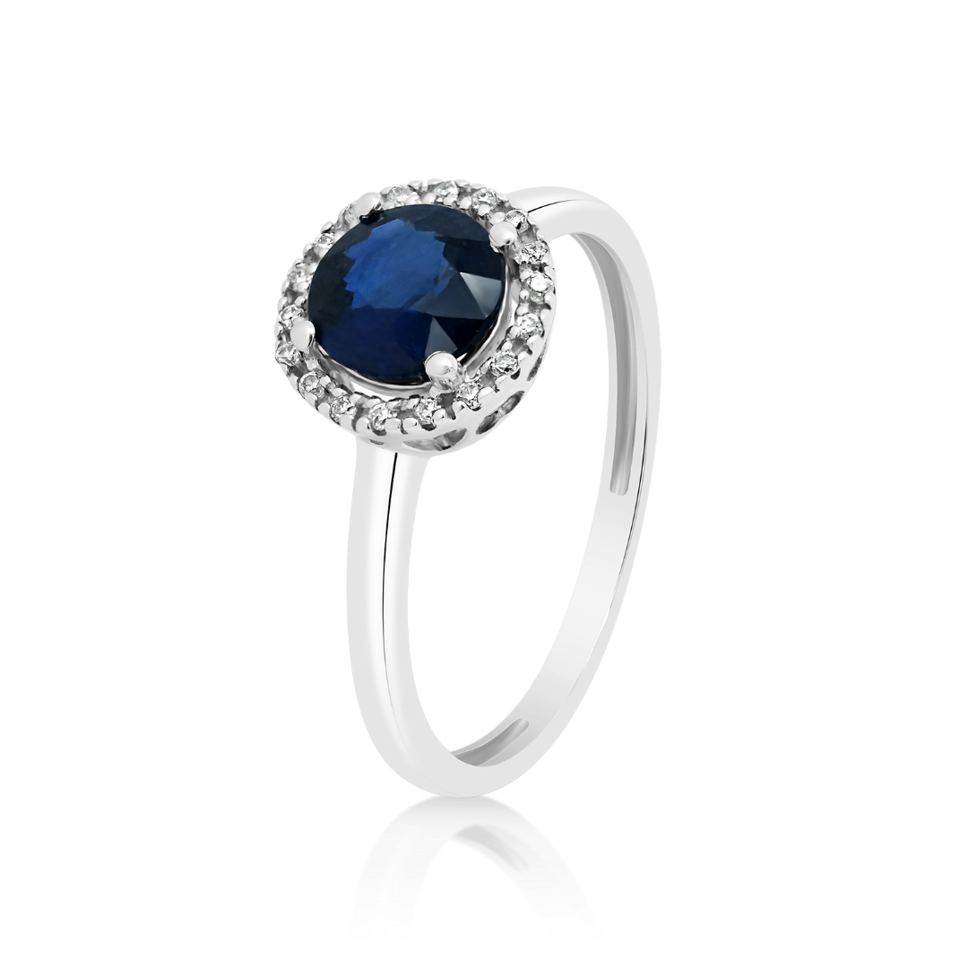 Inel din aur alb de 18K, cu un Safir albastru și Diamante naturale Round Brilliant de 0.06ct.