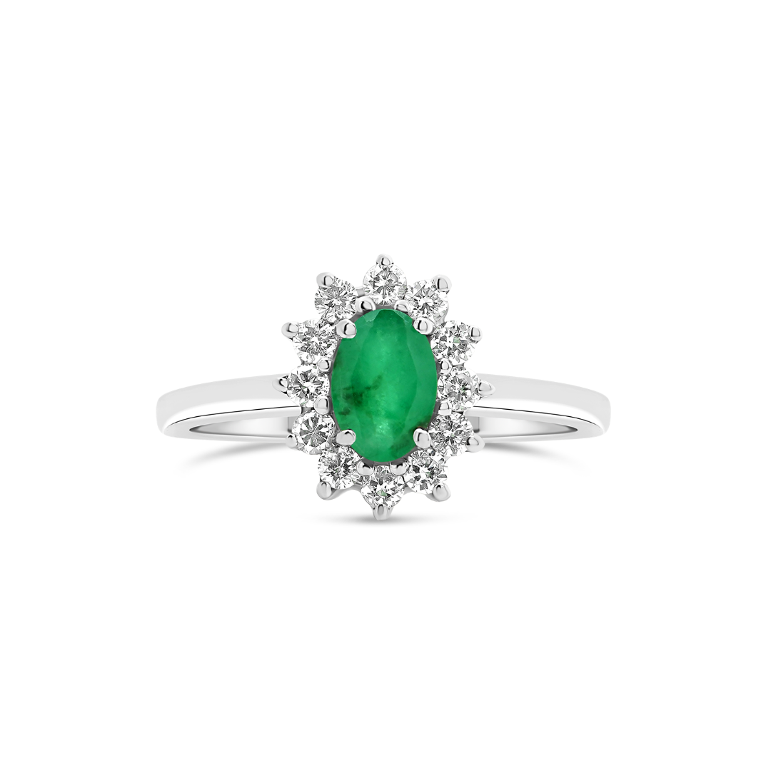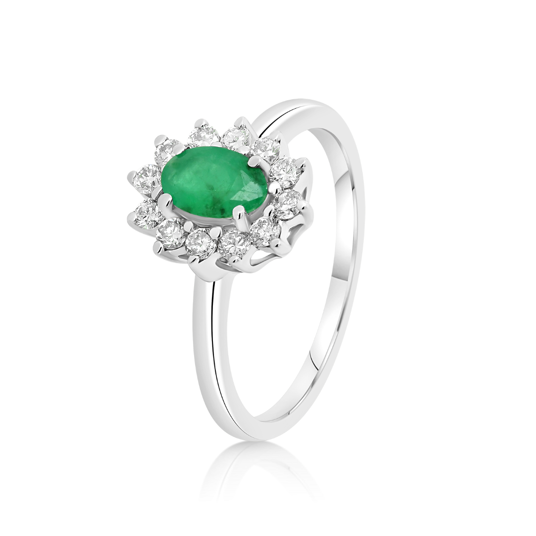 Inel din aur alb de 18K, încrustat cu un Smarald de 0.42ct și 12 Diamante Round Brilliant de 0.24ct.