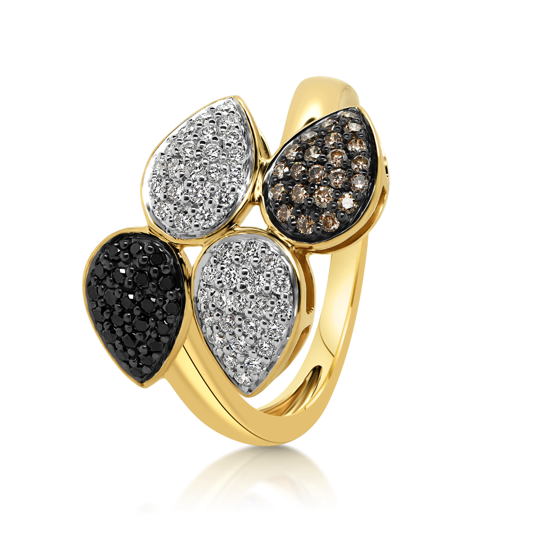 Inel din aur galben de 18K încrustat cu 44 de Diamante incolore de 0.27ct, 22 de Diamante Champagne de 0.15ct și 22 de Diamante negre de 0.14ct.