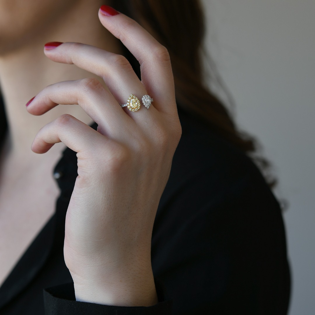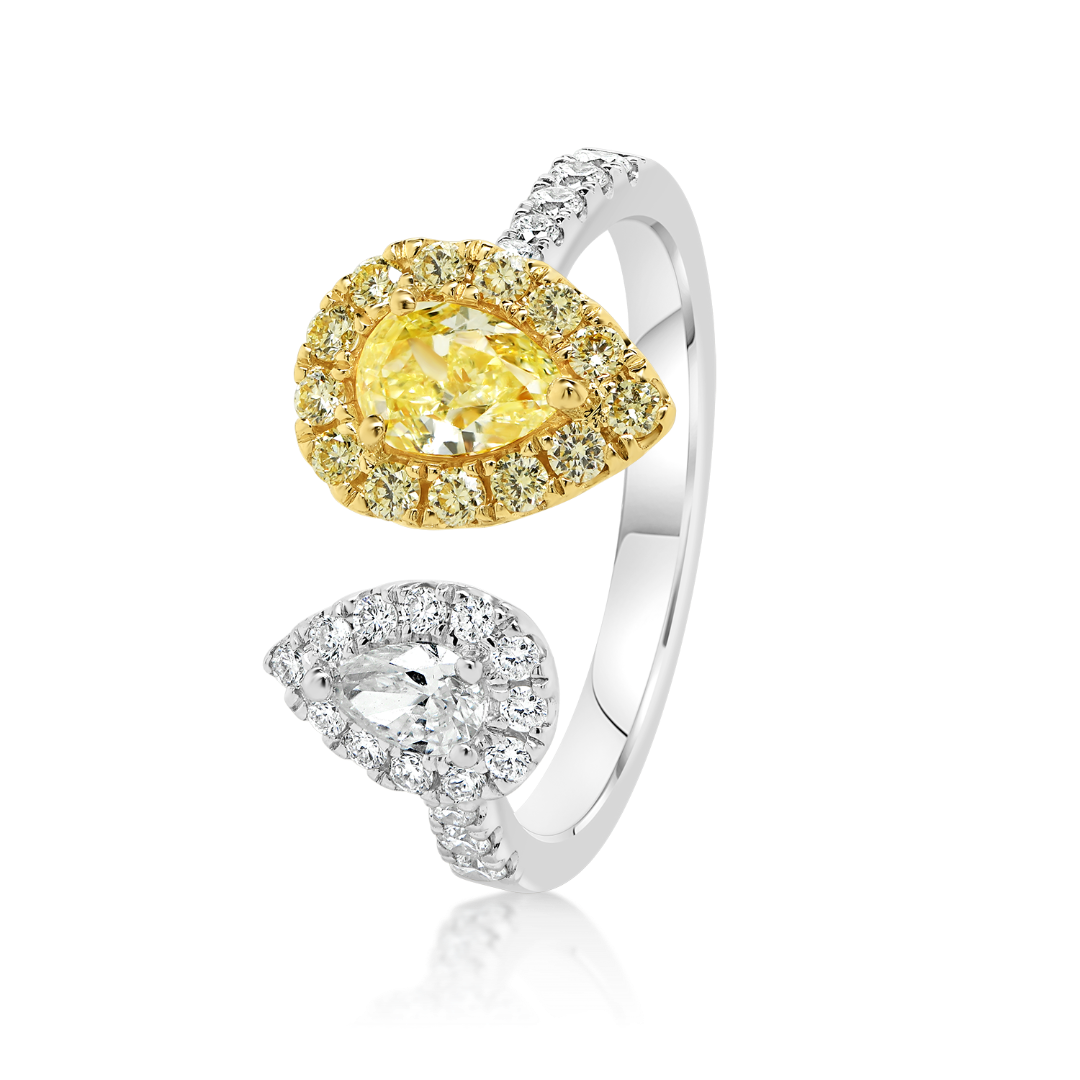 Inel din aur alb de 18K, încrustat cu 36 de Diamante incolore Pear și Brilliant cut de 0.37ct și Diamante Fancy de 0.58ct.