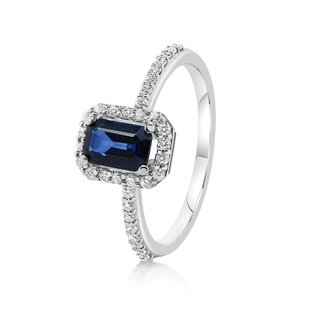 Inel din aur alb de 14K, cu 34 de Diamante de 0.21ct. si un Safir albastru de 0.61ct.