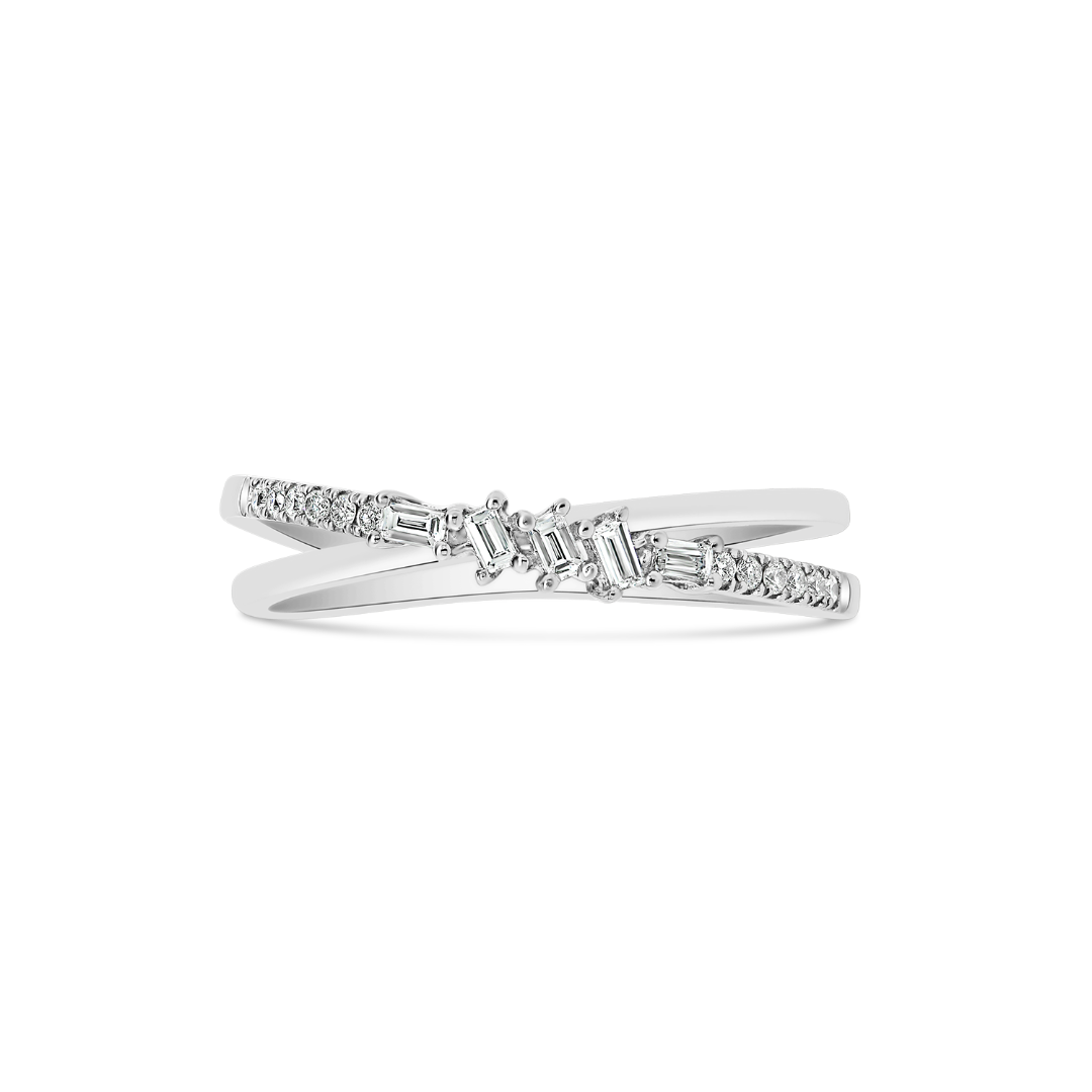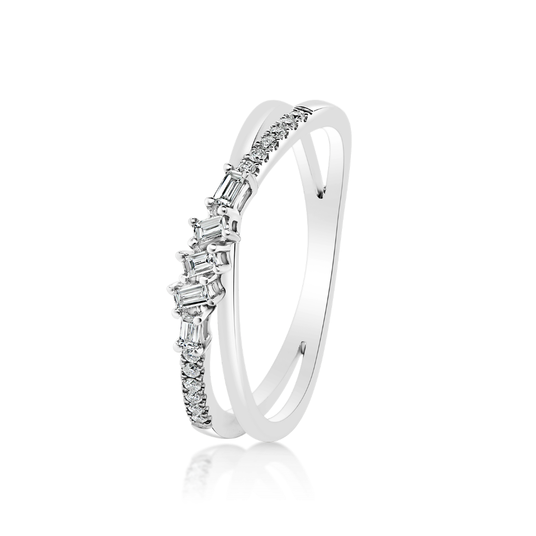 Inel dublu din aur alb de 18K, încrustat cu 17 Diamante naturale, Baguette cut de 0.13ct.