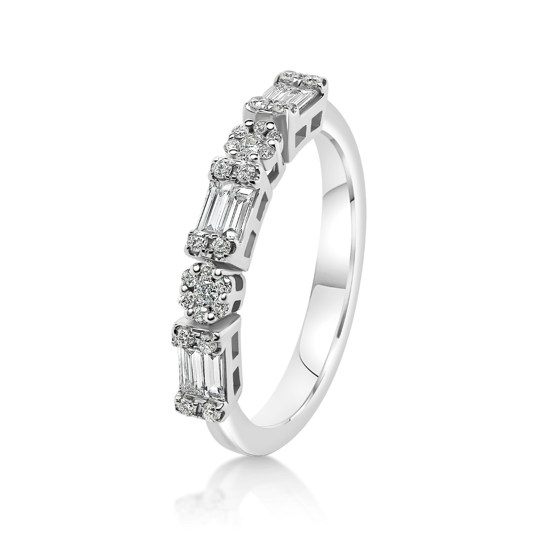Inel din aur alb de 18K, încrustat cu 6 Diamante Baguette de 0.26ct. și 24 Diamante Round Brilliant de 0.16ct.