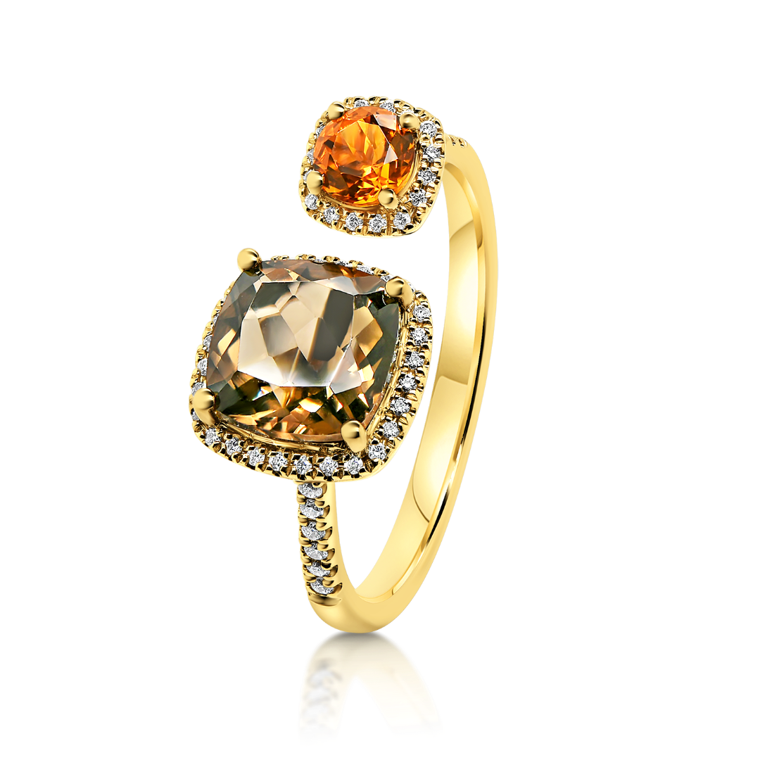 Inel din aur galben de 18K cu Diamante naturale, Citrin și Smoky Quartz