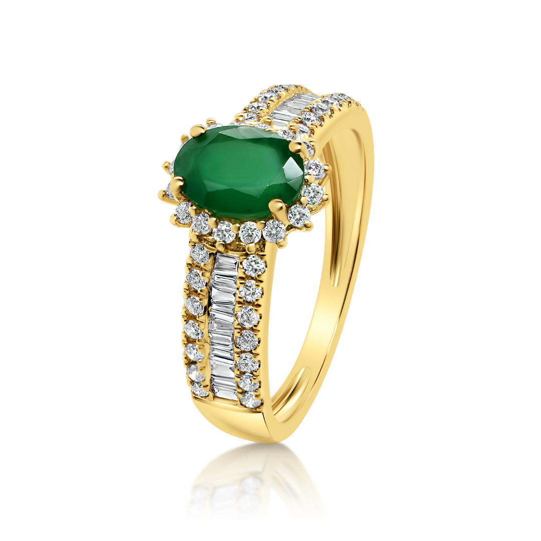 Inel din aur galben de 18K cu 44 de Diamante Brilliant cut de 0.301ct, 20 de Diamante Baguette de 0.135ct și un Smarald de 0.783ct.