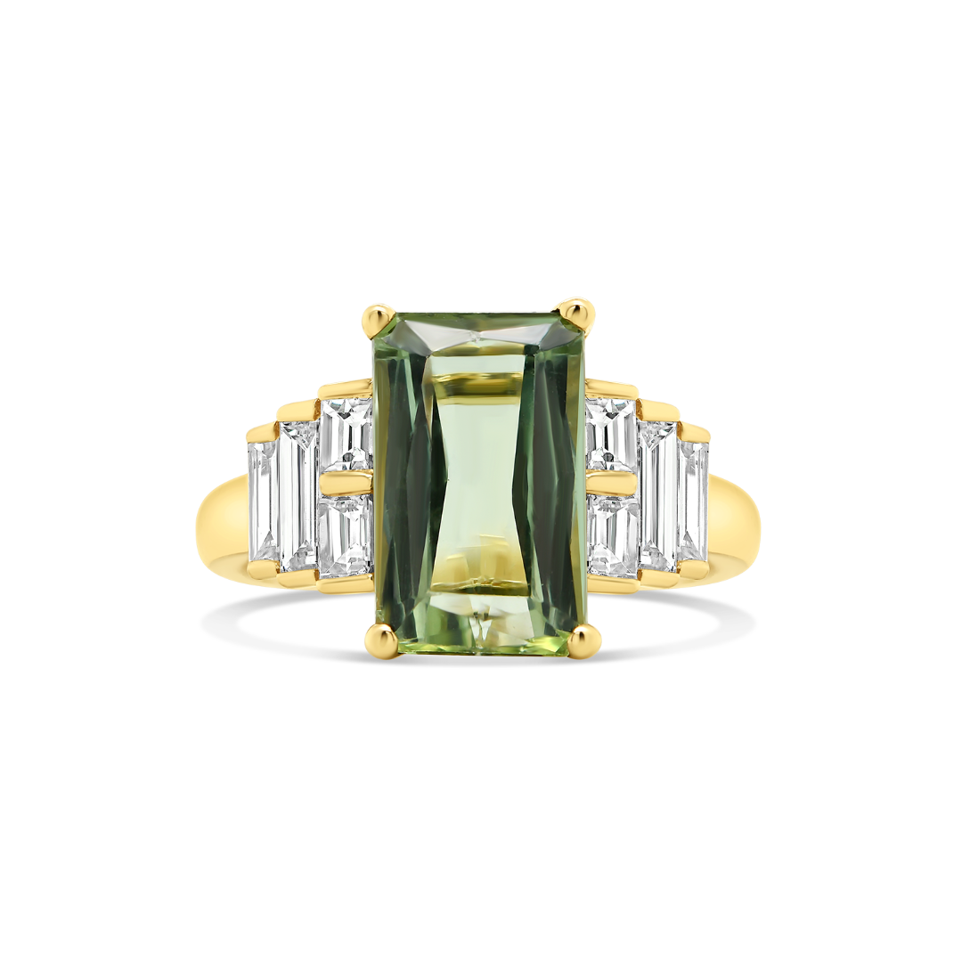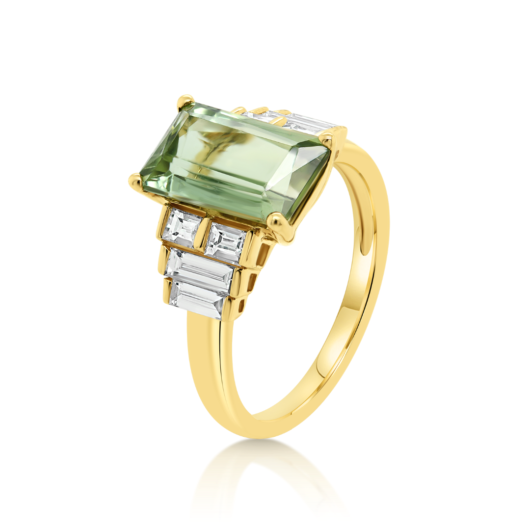 Inel din aur galben de 18K, cu 8 Diamante Baguette de 0.574ct și o piatră Turmalin de 2.848ct.