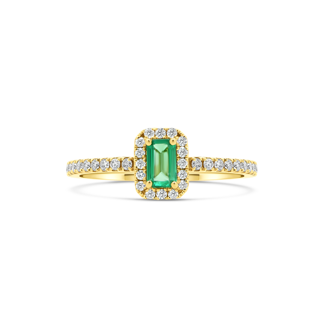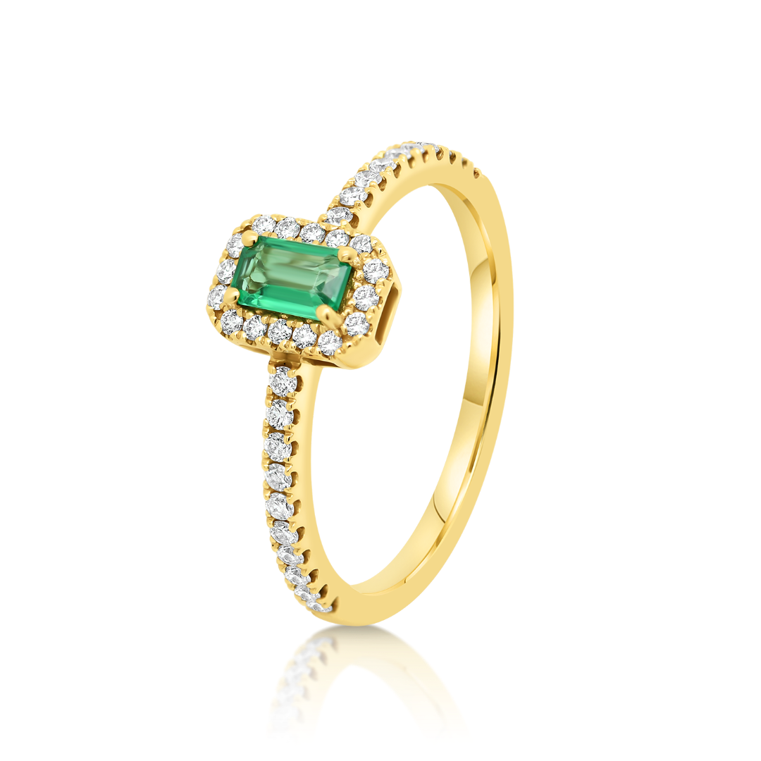 Inel din aur galben de 18K cu un Smarald de 0.20ct și 36 de Diamante Round Brilliant de 0.226ct.