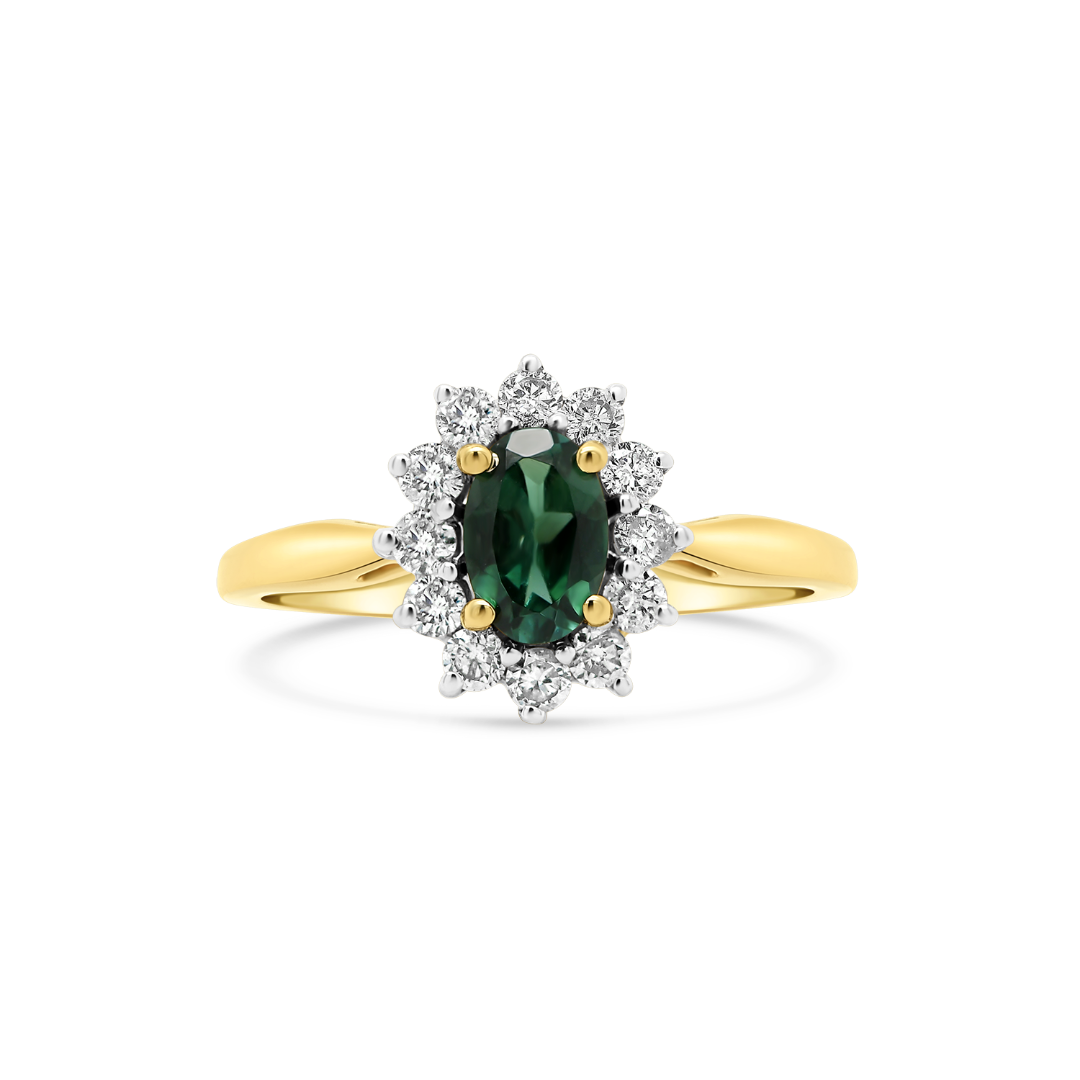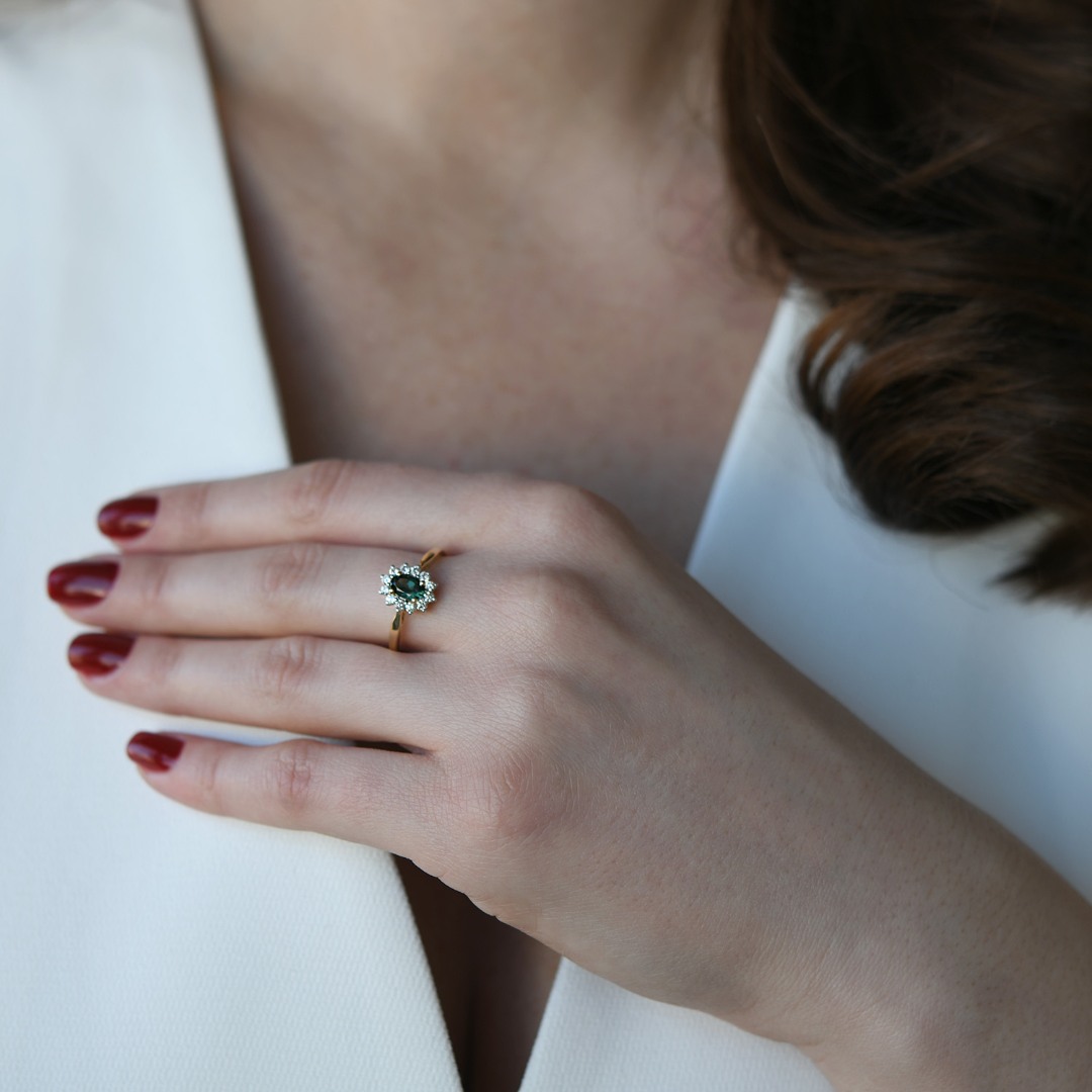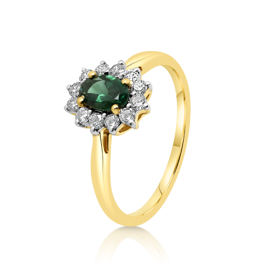 Inel din aur galben de 18K, încrustat cu un Turmalin verde și Diamante naturale Brilliant cut.