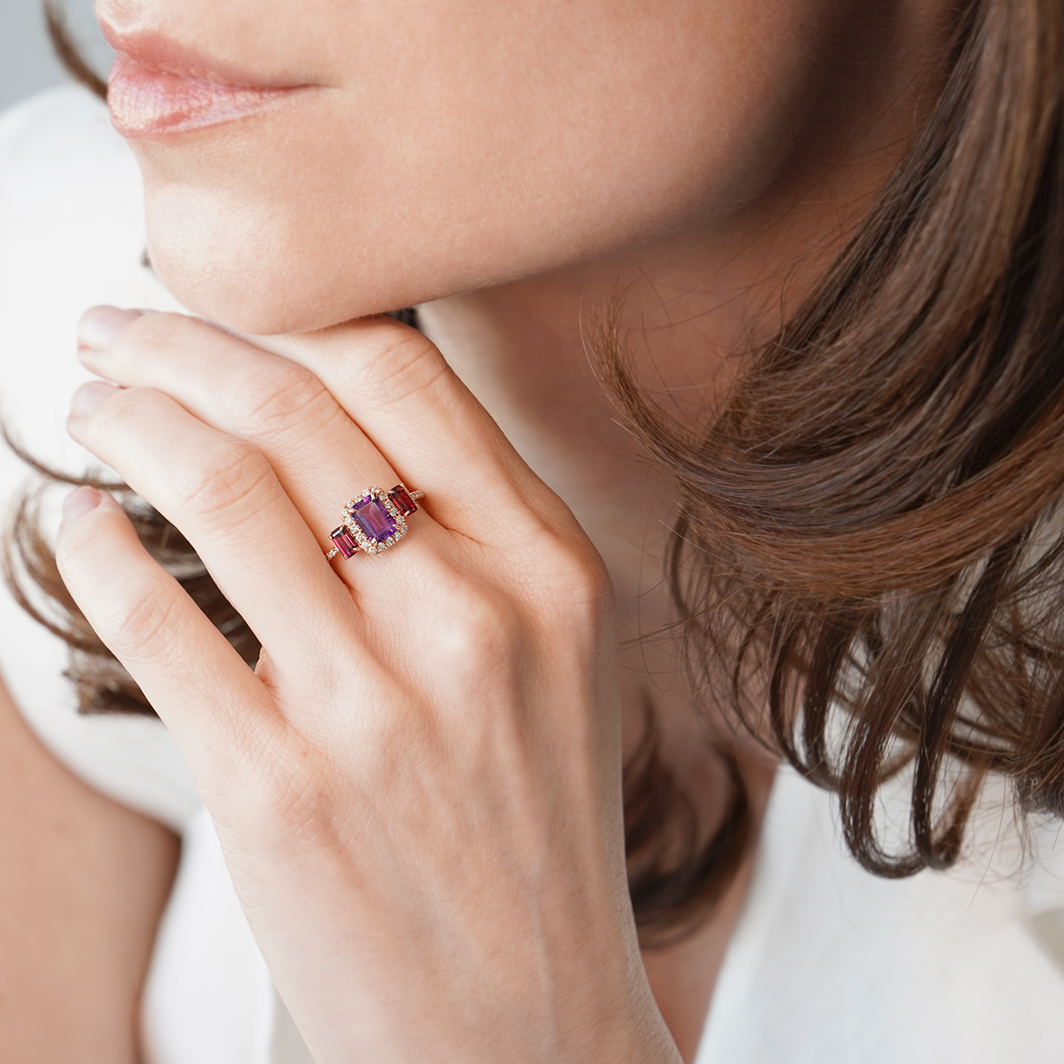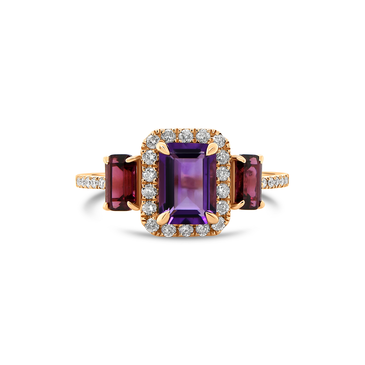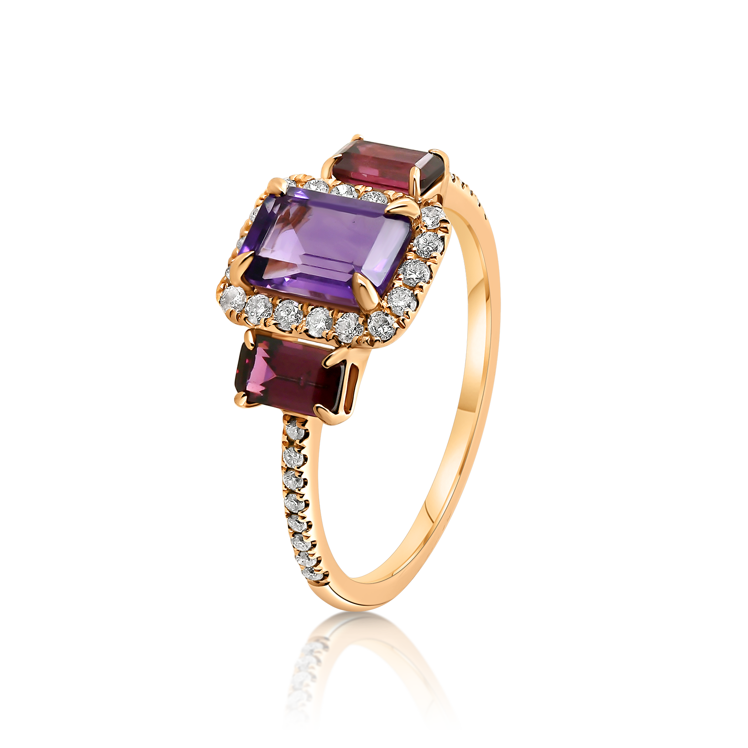 Inel din aur roz de 14K cu Rodolite, Ametist și Diamante naturale