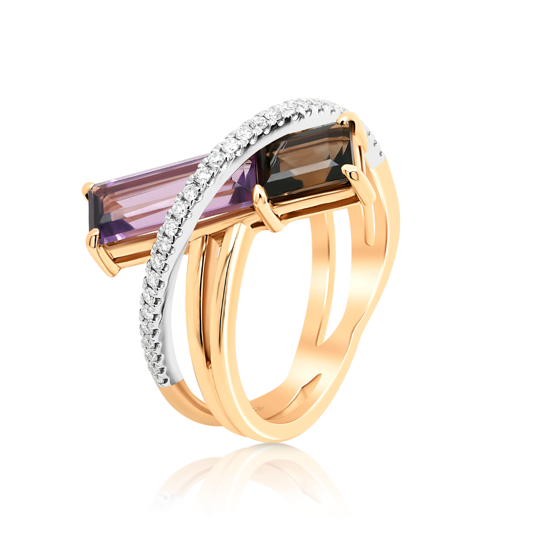 Inel din aur roz de 18K cu Diamante naturale, Ametist și Quartz