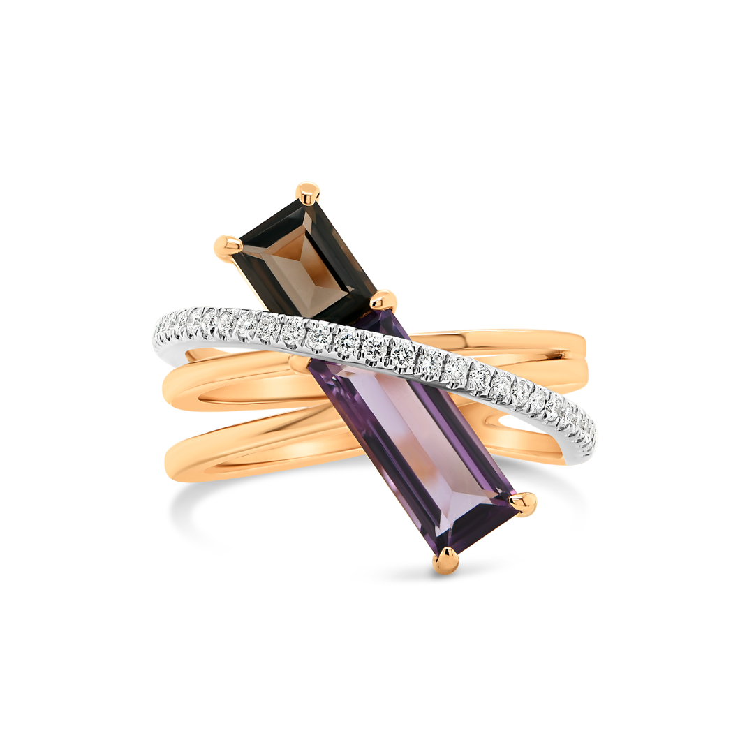 Inel din aur roz de 18K cu 29 de Diamante naturale, Round Brilliant de 0.172ct, un Ametist de 1.39ct și un Quartz fumuriu de 0.635ct.