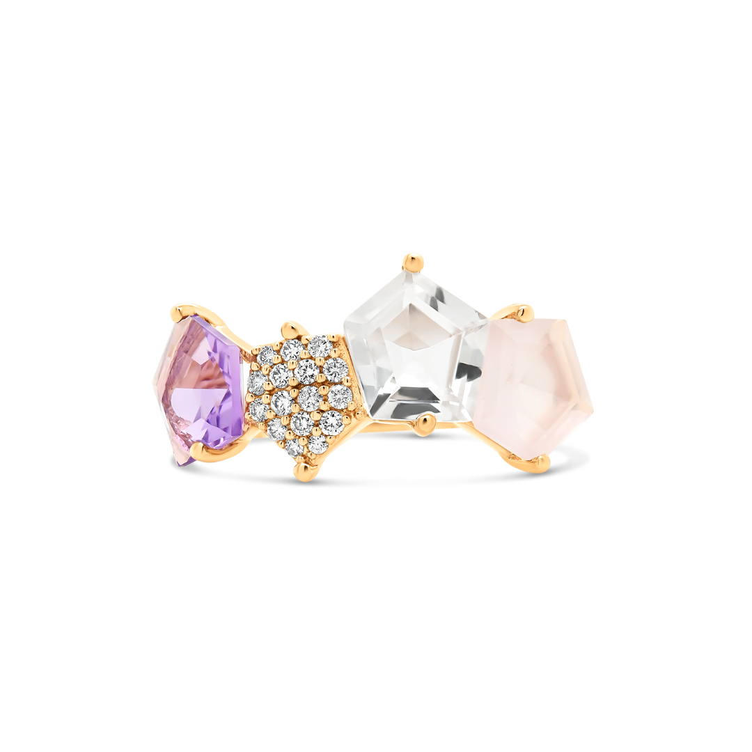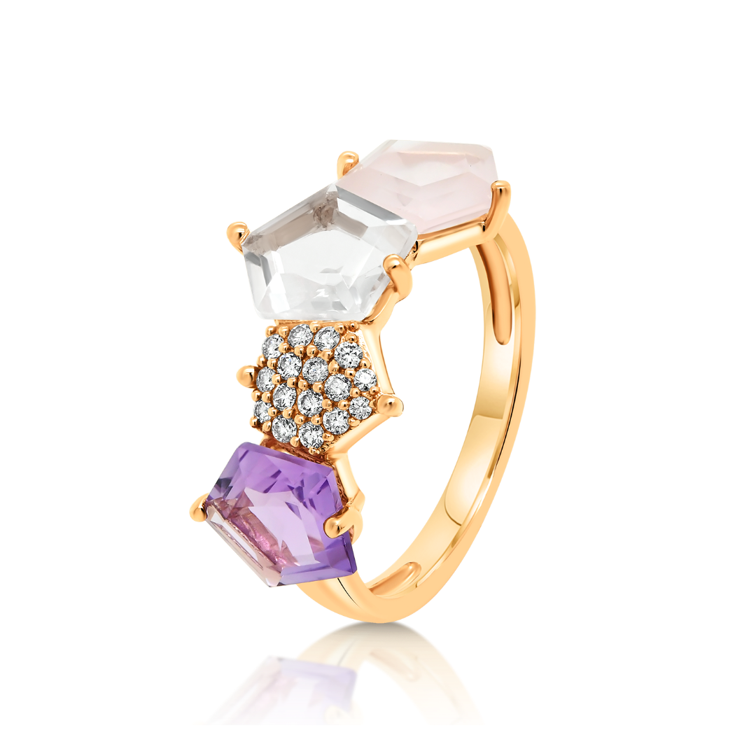 Inel din aur roz de 18K cu Ametist, Quartz și Diamante naturale