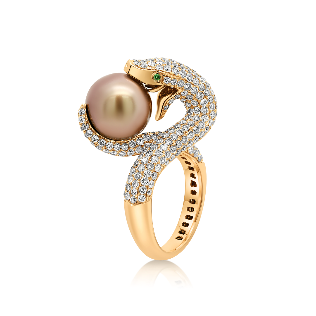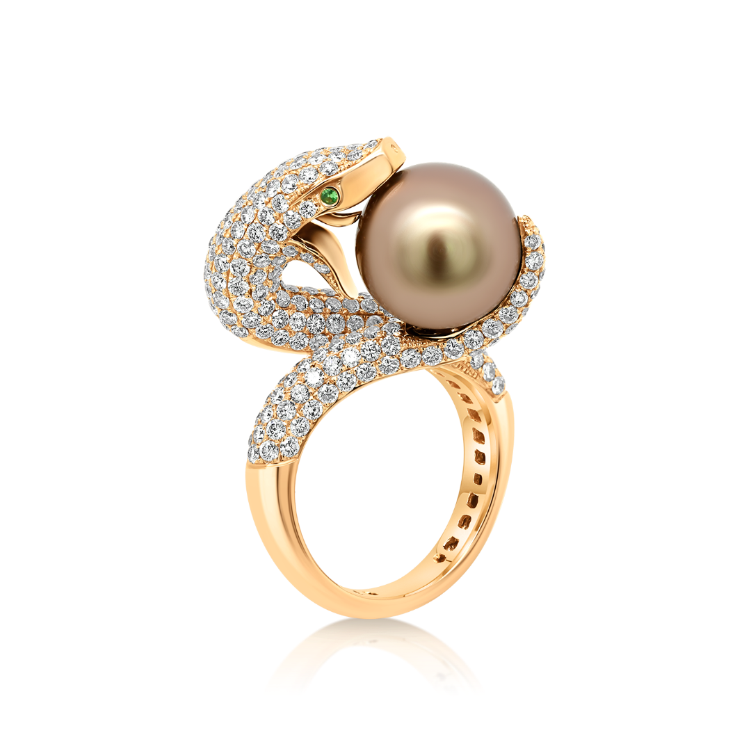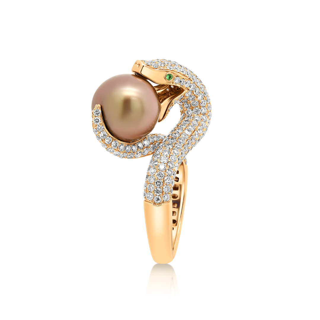 Inel din aur roz de 18K cu Perlă, Smaralde și Diamante naturale