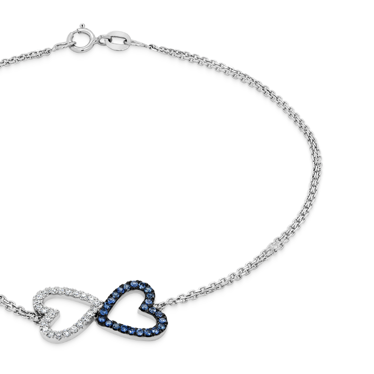Brățară cu lanț dublu din aur alb de 18K și elemente în formă de inimă încrustate cu Safire și Diamante naturale.