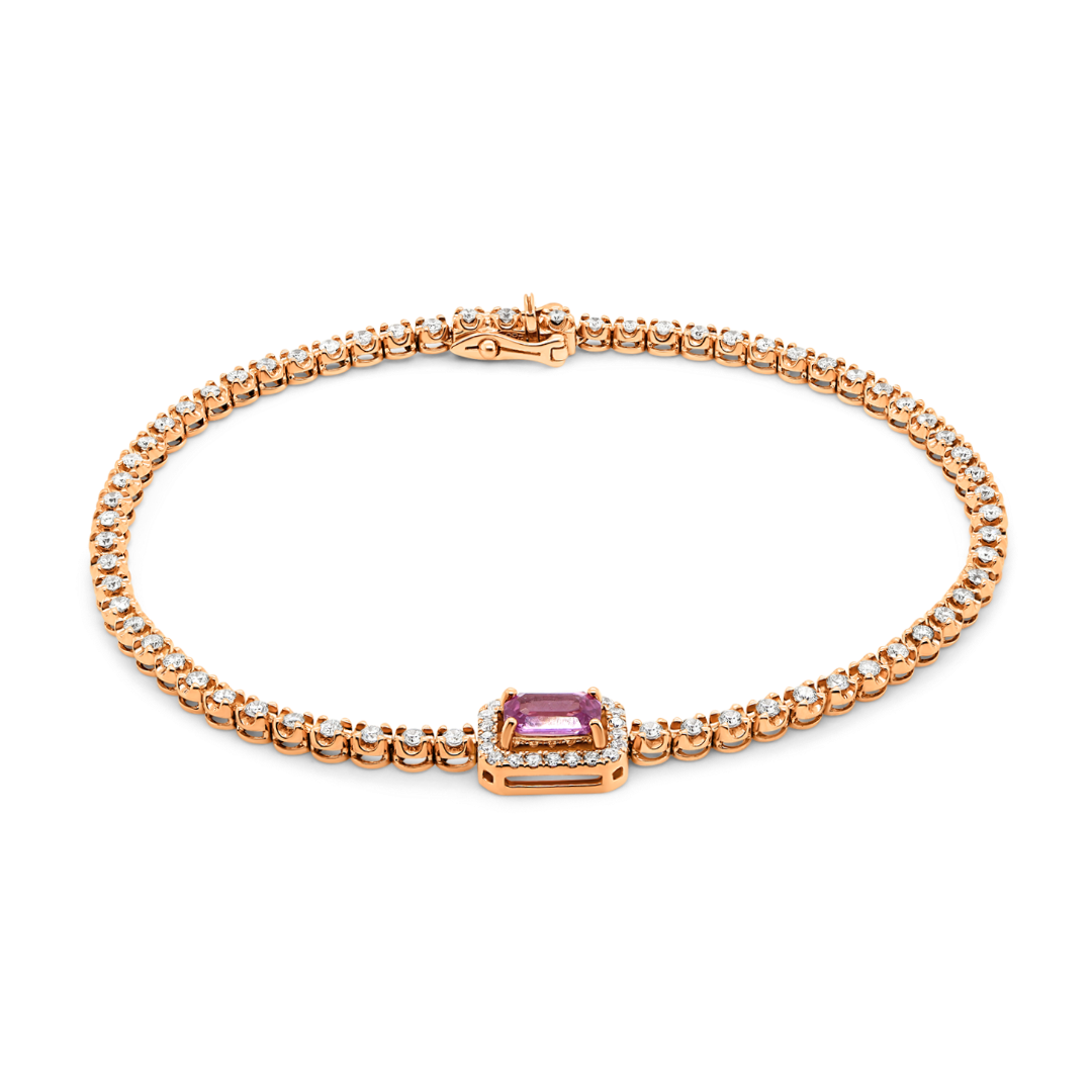 Brățară Tennis din aur roz de 18K, încrustată cu 86 de Diamante naturale Round Brilliant de 1.03ct. și un Safir roz de 0.58ct.