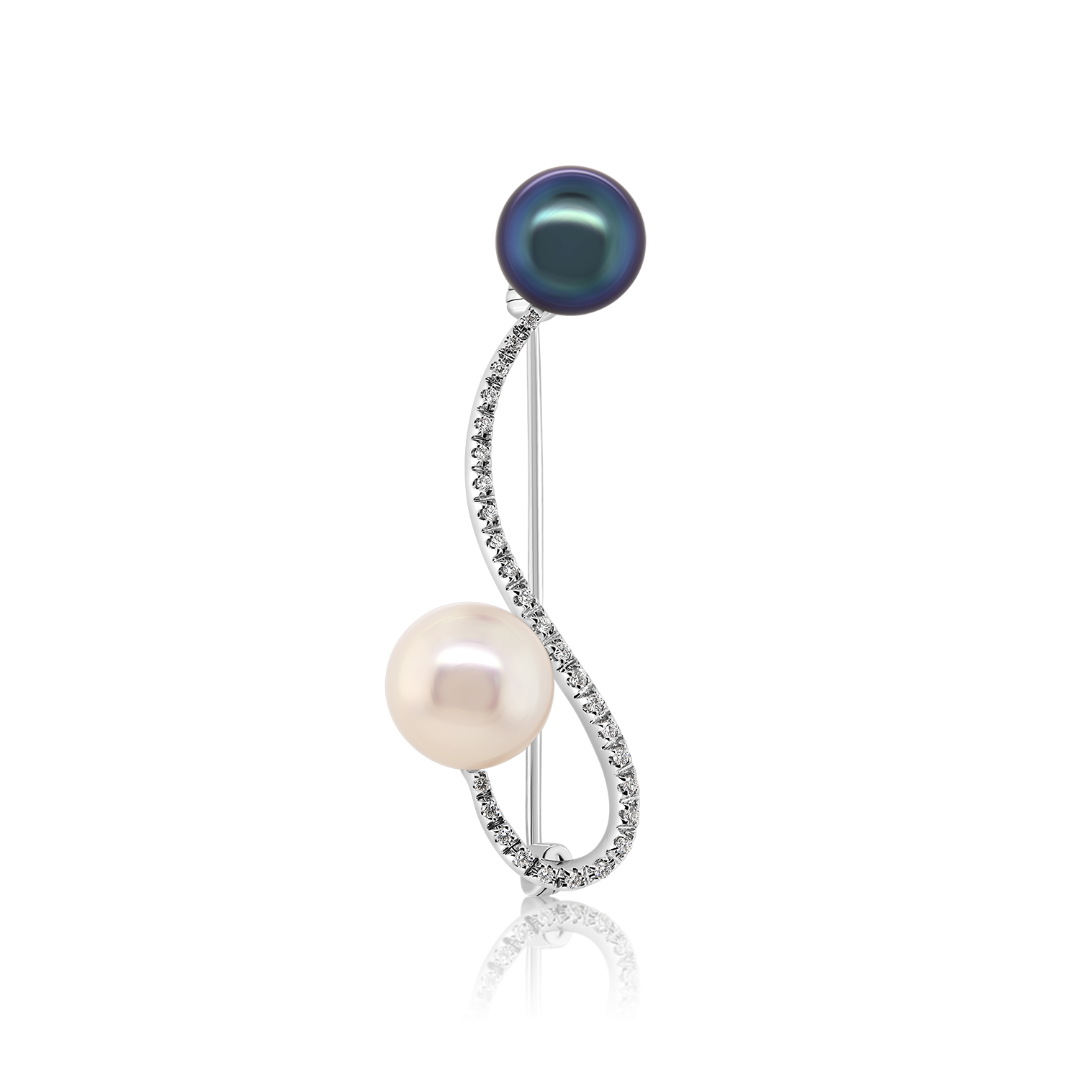 Broșă din aur alb de 14K, cu două Perle de cultură și 27 de Diamante round brilliant de 0.13ct.