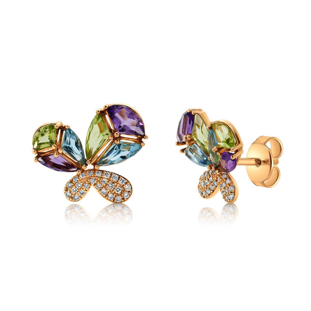 Cercei din aur roz de 18K, cu Diamante de 0.13ct, G-H/SI1, Ametist de 0.77ct, Blue topaz de 0.88ct. și Peridot de 0.78ct.