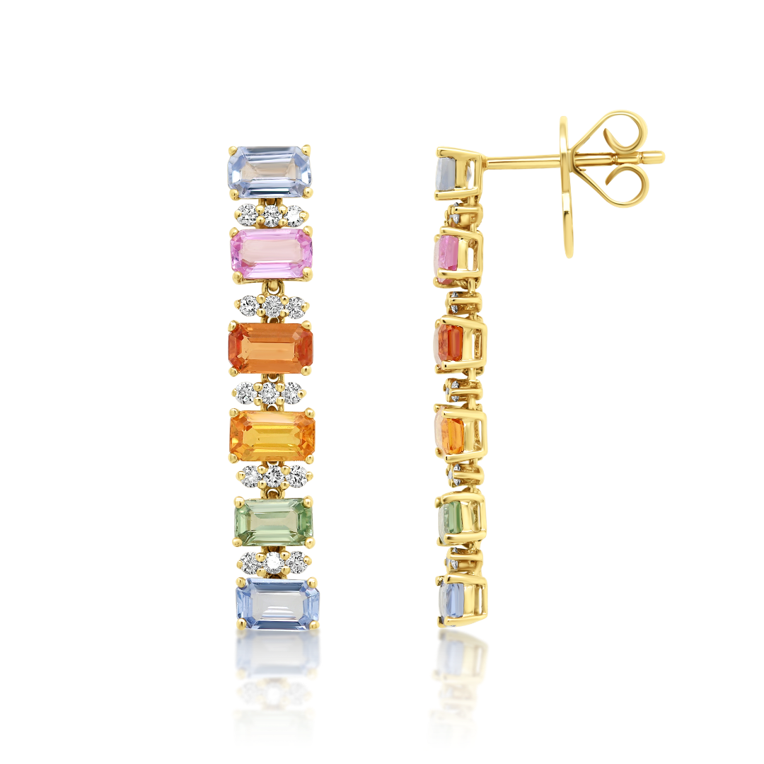 Cercei din aur galben de 18K cu 30 de Diamante naturale Round Brilliant de 0.298ct și 12 Safire Fancy de 4.089ct.