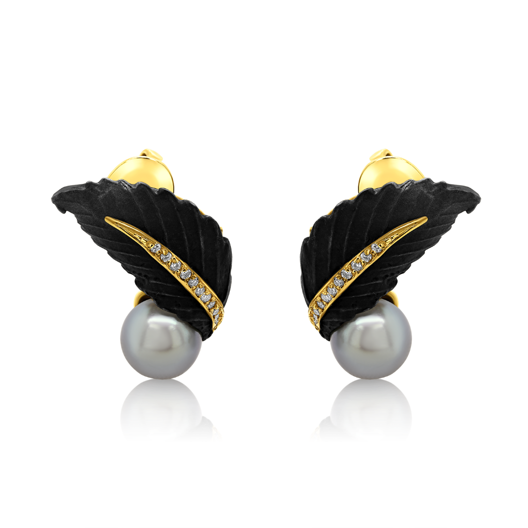 Cercei din aur galben de 18K cu cu rodiu negru, Perle și Diamante naturale.