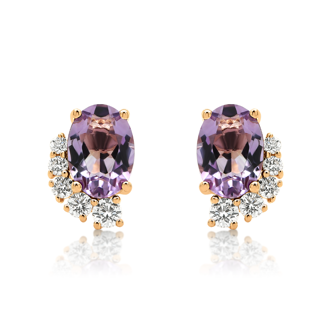 Cercei din aur roz de 18K, cu două Ametiste de 1.374ct și 10 Diamante Round Brilliant de 0.208ct.