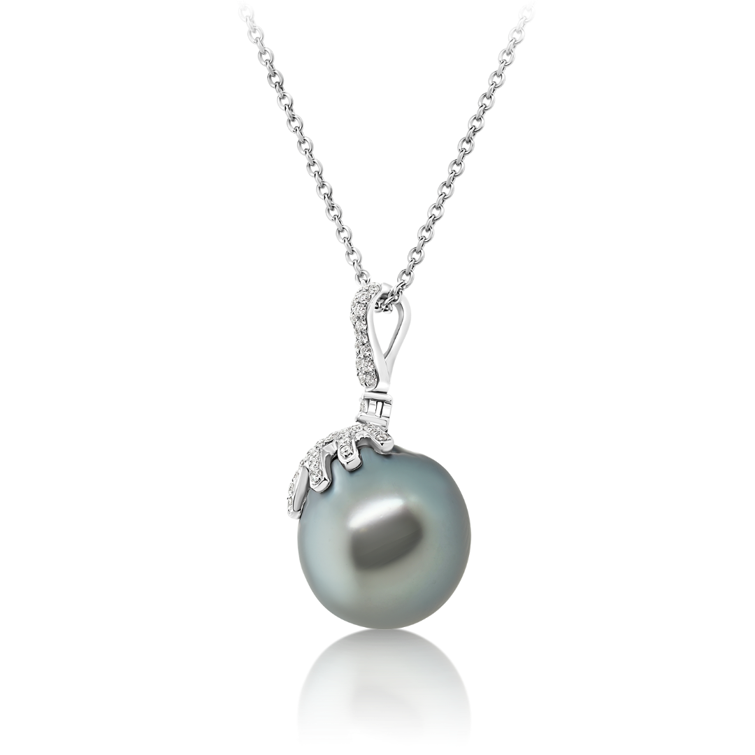 Lanț din aur alb de 18K și pandantiv cu Perlă gri de cultură și Diamante round brilliant de 0.34ct.