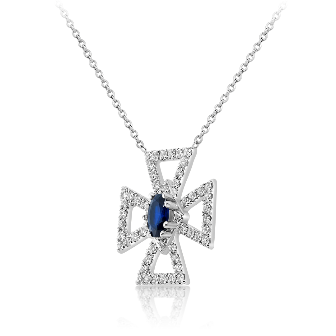 Colier din aur alb de 18K inspirat din bijuteriile Reginei Maria a României. Pandantivul cruce este încrustat cu un Safir albastru de 0.20ct și Diamante brilliant cut de 0.26ct.
