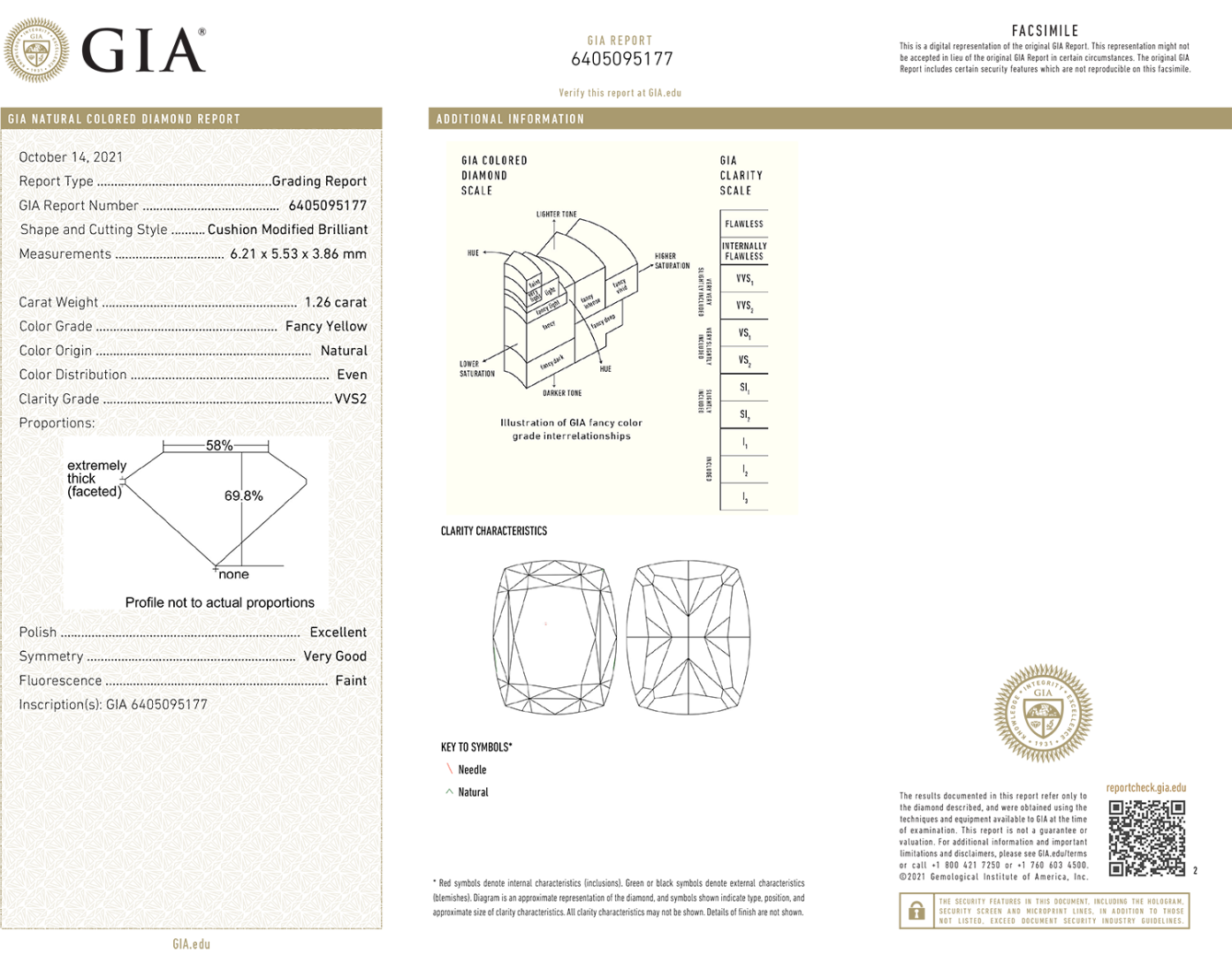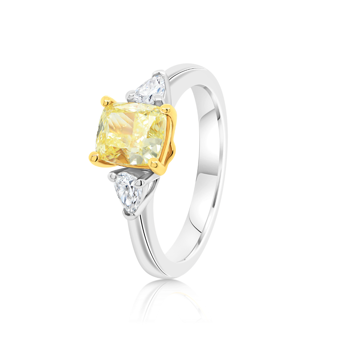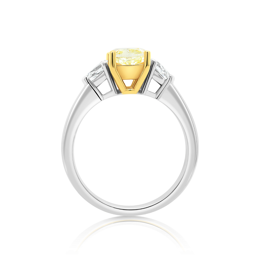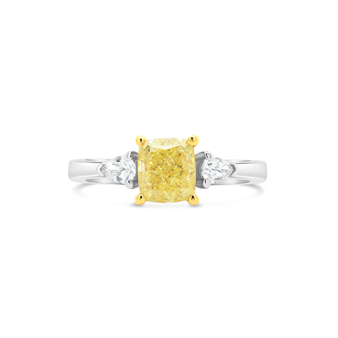 Inel din aur alb de 18K încrustat cu un Diamant Fancy, certificat la Institutul Gemologic GIA cu numărul 6405095177, de 1.26ct și două Diamante Pear incolore cu o greutate de 0.25ct.
