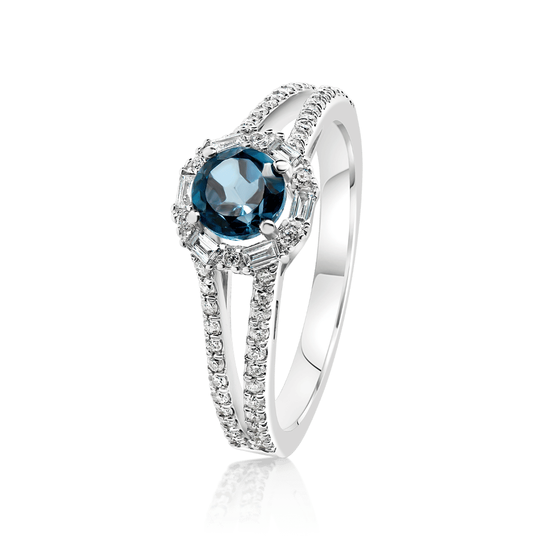 Inel din aur alb de 14K încrustat cu 6 Diamante Baguette de 0.10ct., 54 Diamante Round Brilliant de 0.22ct. și o piatră centrală London Blue Topaz de 0.77ct.