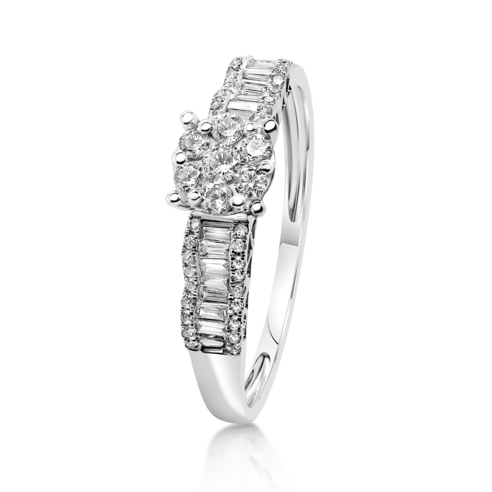 Inel din aur alb de 18K, încrustat cu Diamante Baguette și Diamante Round Brilliant.
