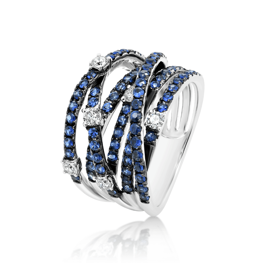 Inel din aur alb de 18K, cu 6 Diamante Round Brilliant de 0.35ct și 110 Safire albastre de 1.19ct.