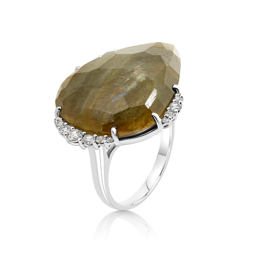 Inel din aur alb de 18K, cu un Labradorit de 19.21ct și 19 Topaze incolore de 0.48ct.