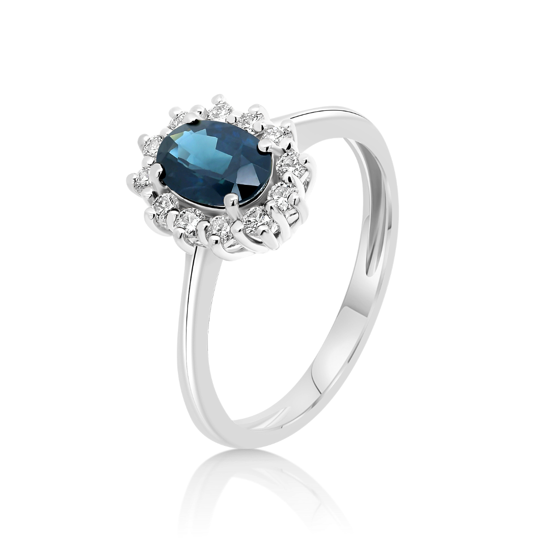 Inel din aur alb de 18K cu un Safir albastru de 0.97ct și Diamante Round Brilliant de 0.24ct.