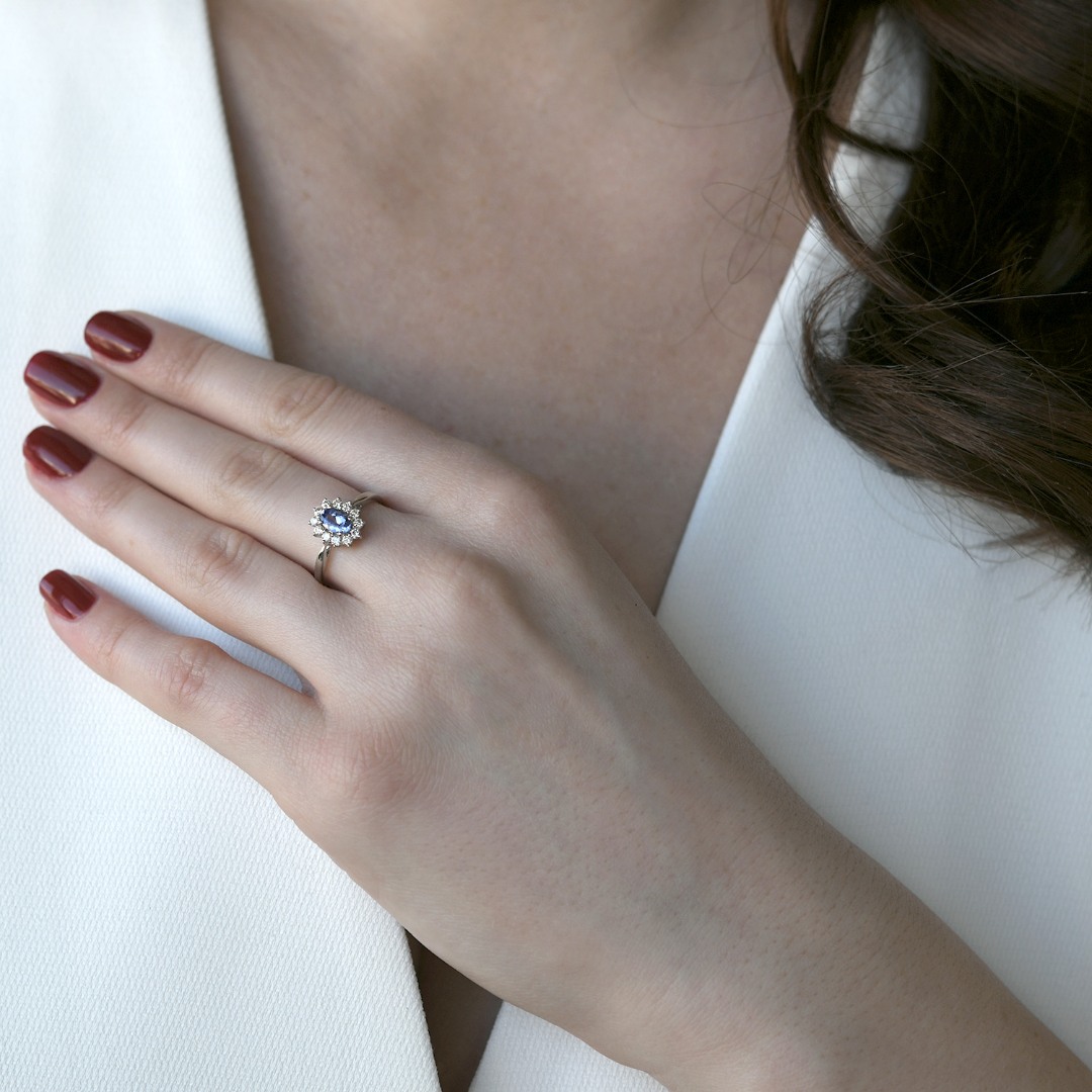 Inel din aur alb de 18K, încrustat central cu un Tanzanit și lateral cu 12 Diamante Brilliant cut.
