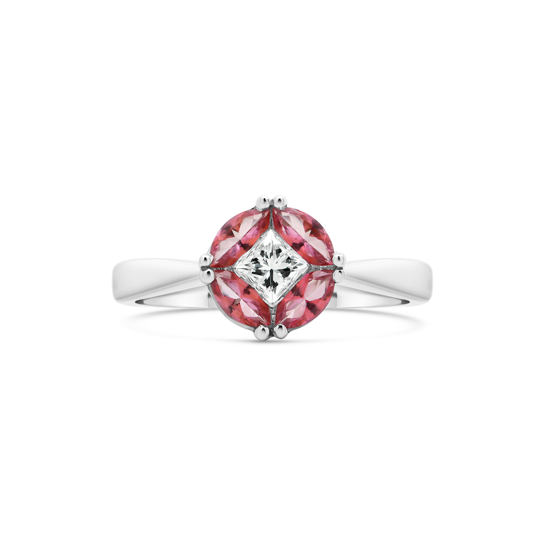 Inel din aur alb de 18K, cu 4 Topaze roz și un Diamant Princess cut de 0.26ct.