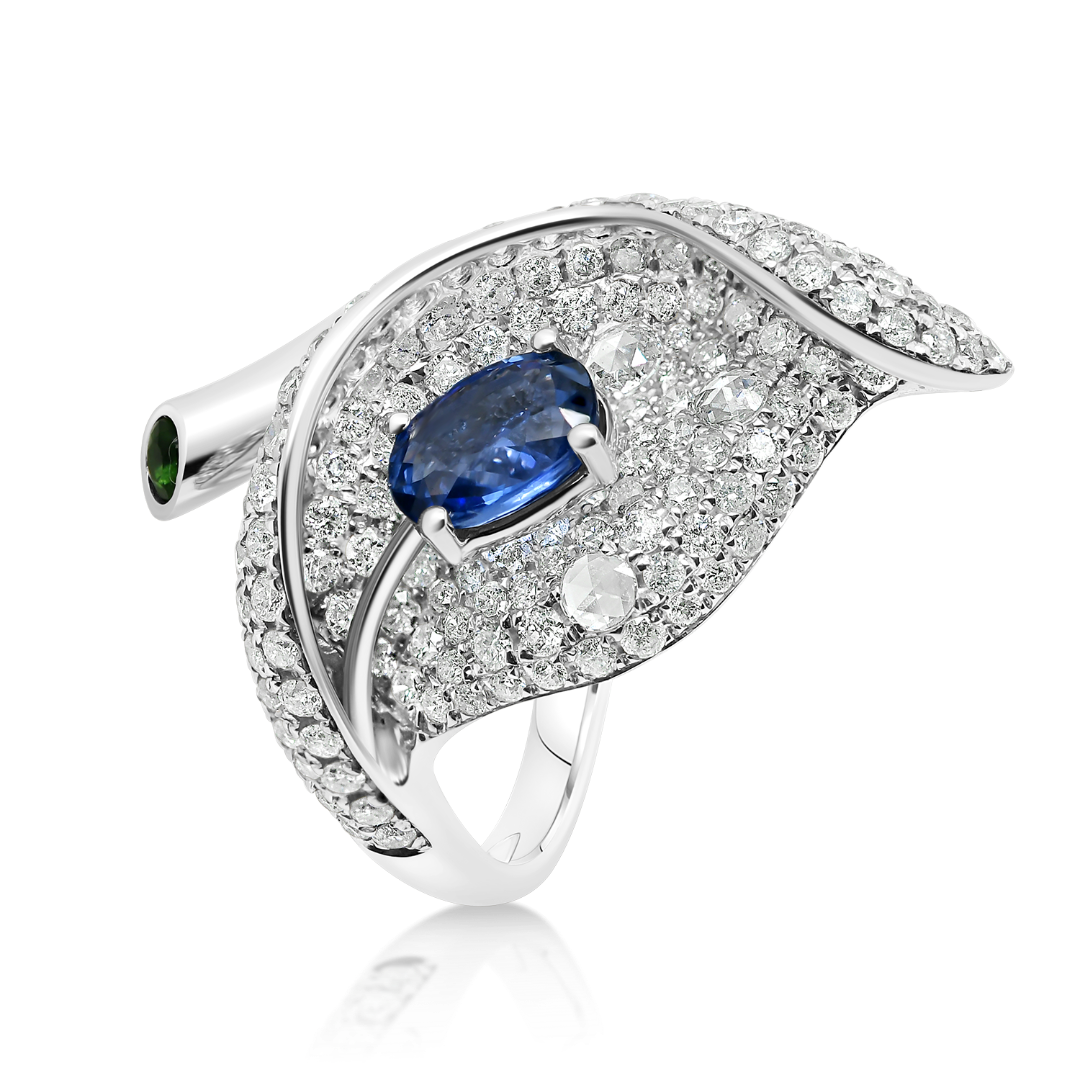Inel din aur alb de 18K încrustat cu un Turmalin de 0.08ct, un Safir albastru de 1.02ct și Diamante Brilliant cut de 1.72ct.