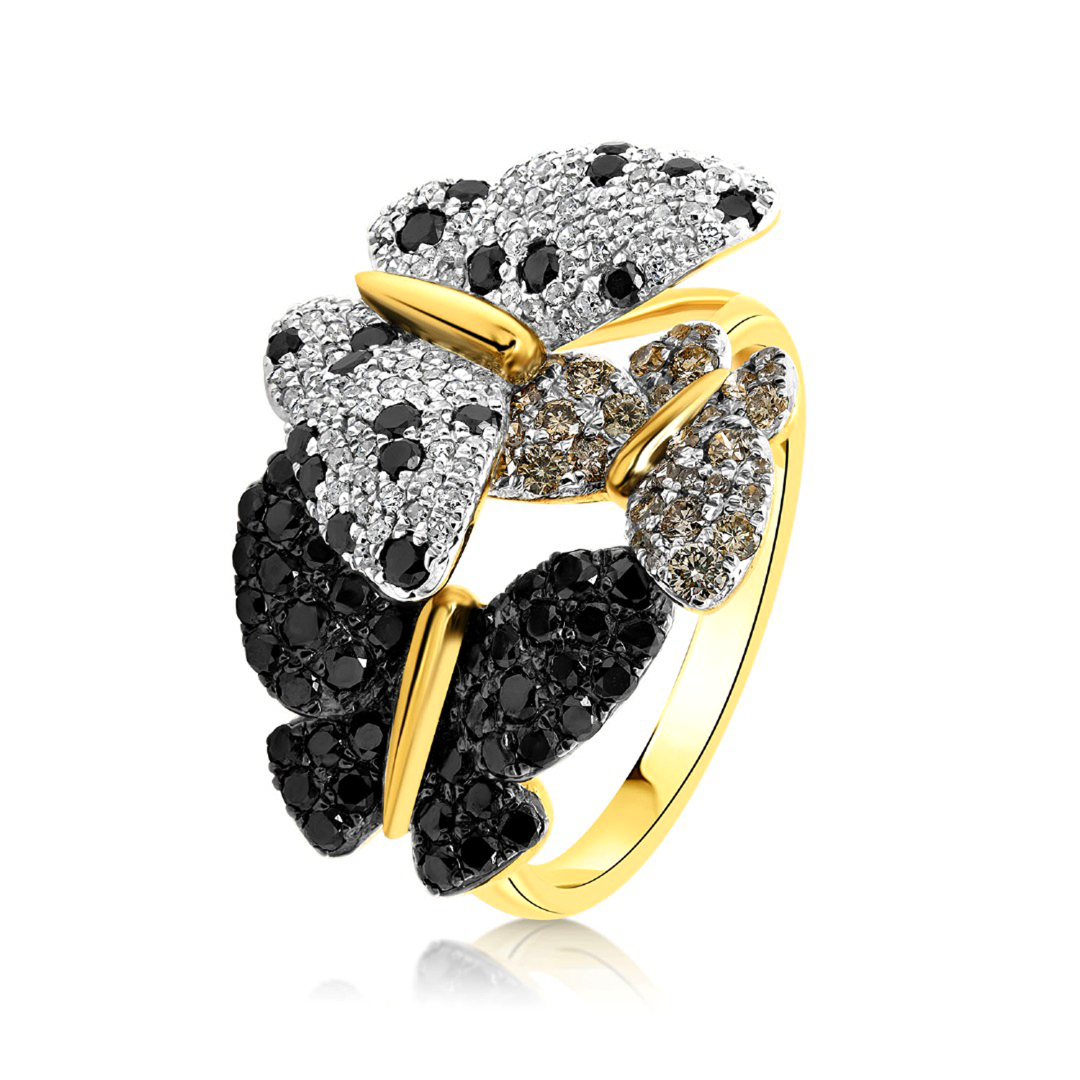 Inel din aur galben de 18K cu elemente în formă de fluture încrustate cu 122 de Diamante incolore de 0.239ct., 63 de Diamante negre de 0.676ct. și 18 Diamante Champagne de 0.195ct.