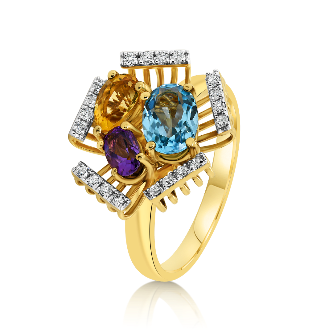 Inel din aur galben de 14K, încrustat cu Diamante de 0.16ct G-H/SI2, Topaz de 0.8ct, Ametist de 0.23ct și Citrin de 0.46ct.