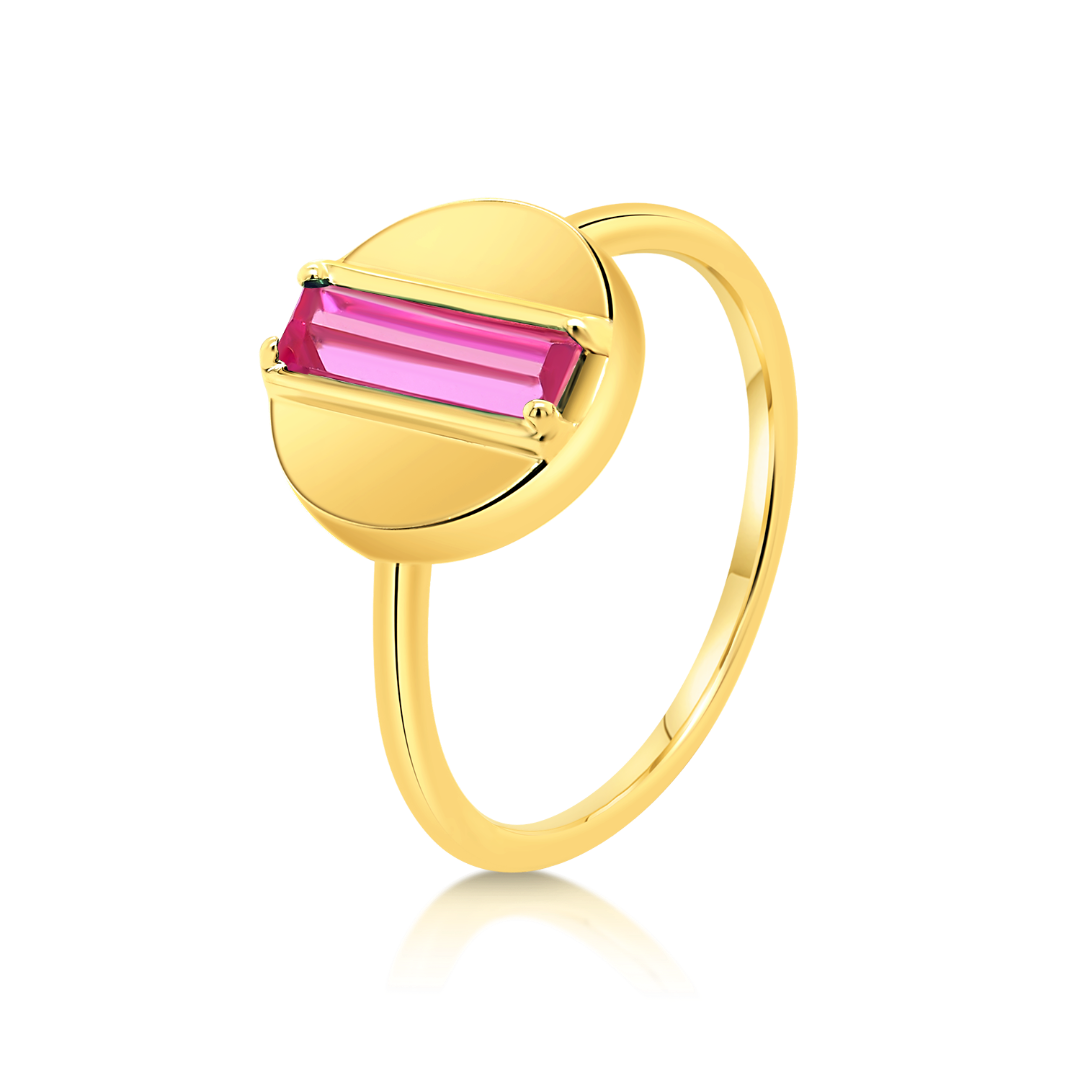Inel din aur galben de 14K cu design geometric și piatră cubic zirconia roz.