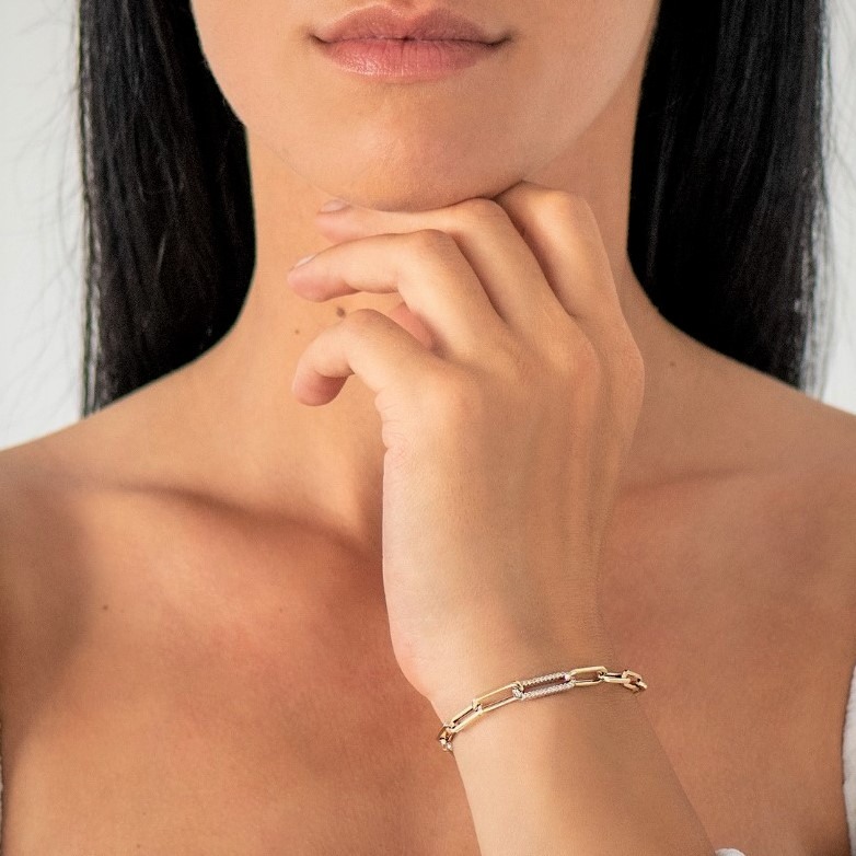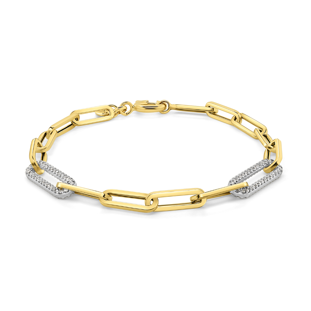 Brățară din aur galben de 14K, cu elemente din aur alb încrustate cu pietre Cubic Zirconia.