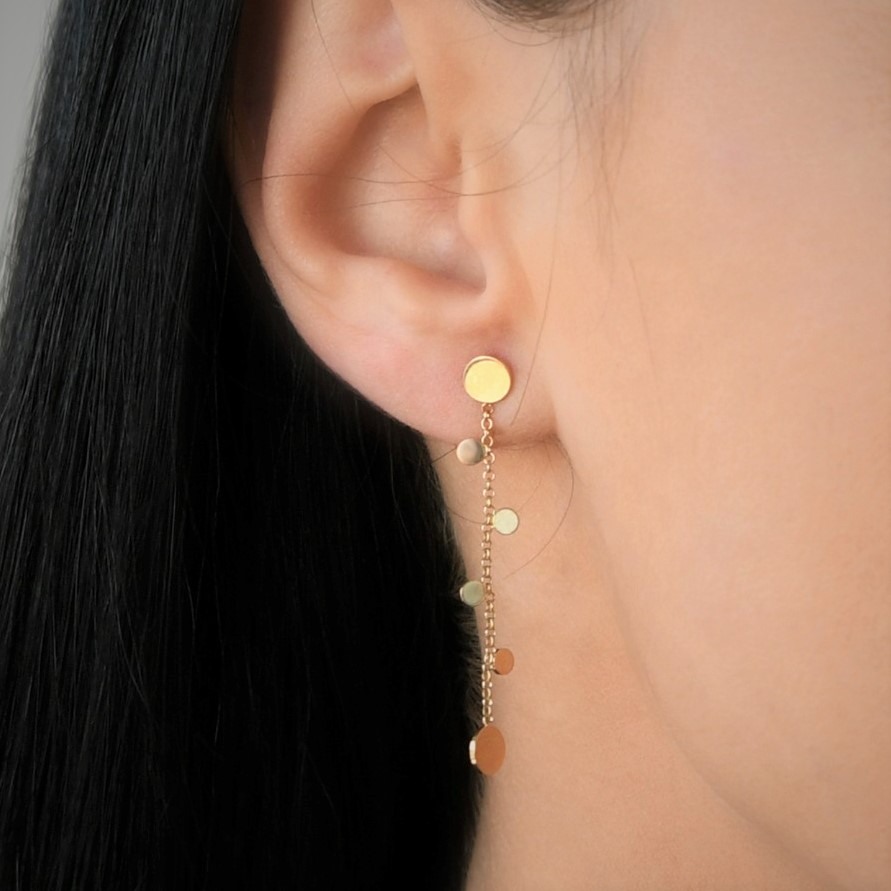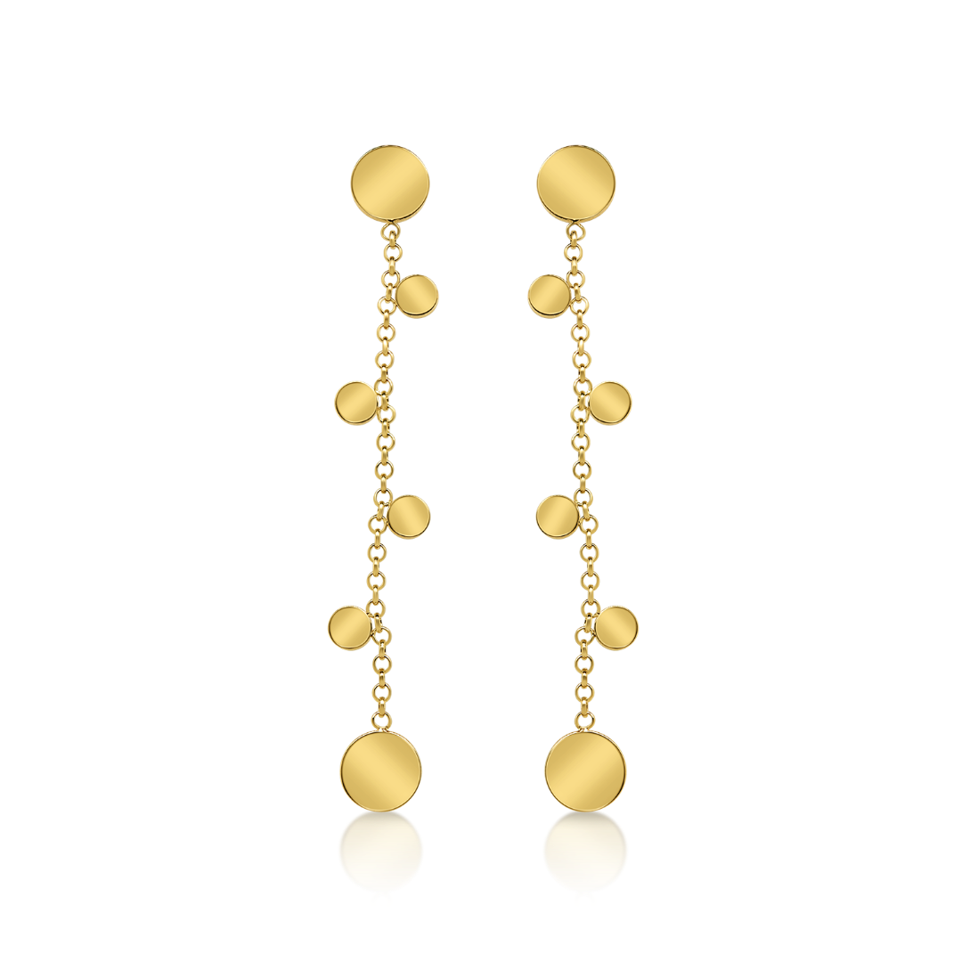 Cercei din aur galben de 14K, cu lanț și elemente rotunde.