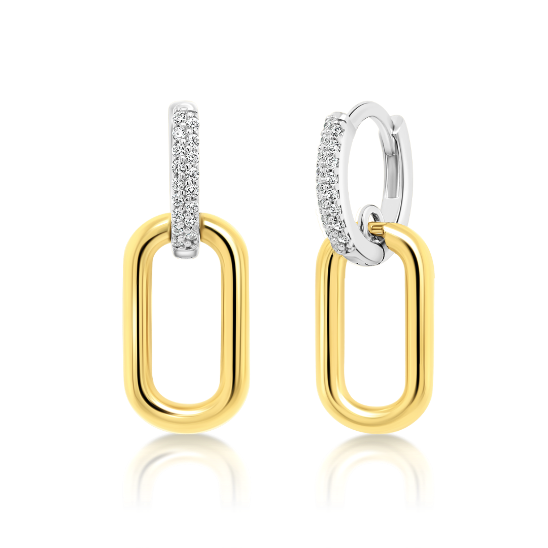 Cercei din aur galben de 14K, cu elemente din aur alb încrustate cu pietre Cubic Zirconia.