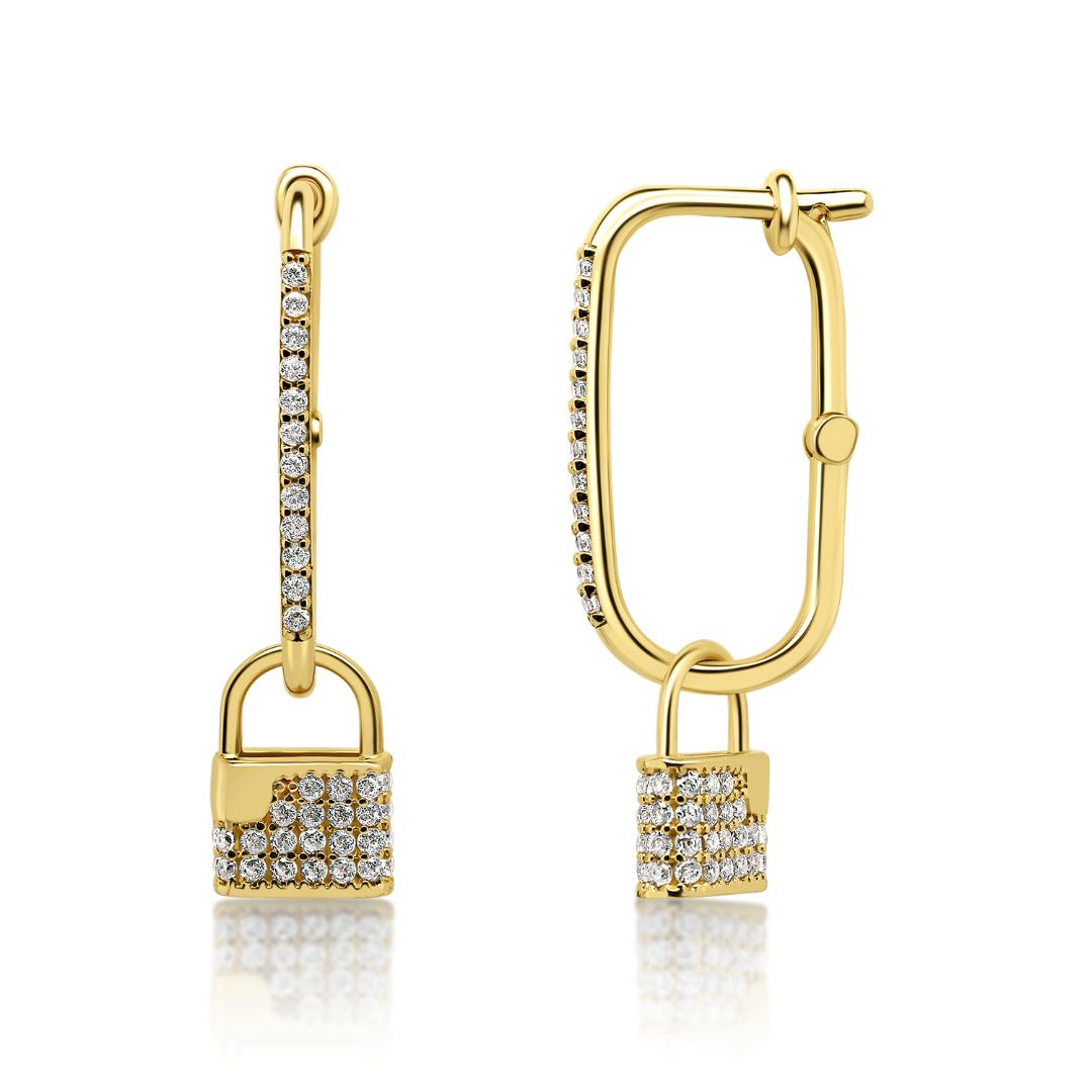 Cercei din aur galben de 14K, cu elemente în formă de lacăt și pietre Cubic Zirconia.