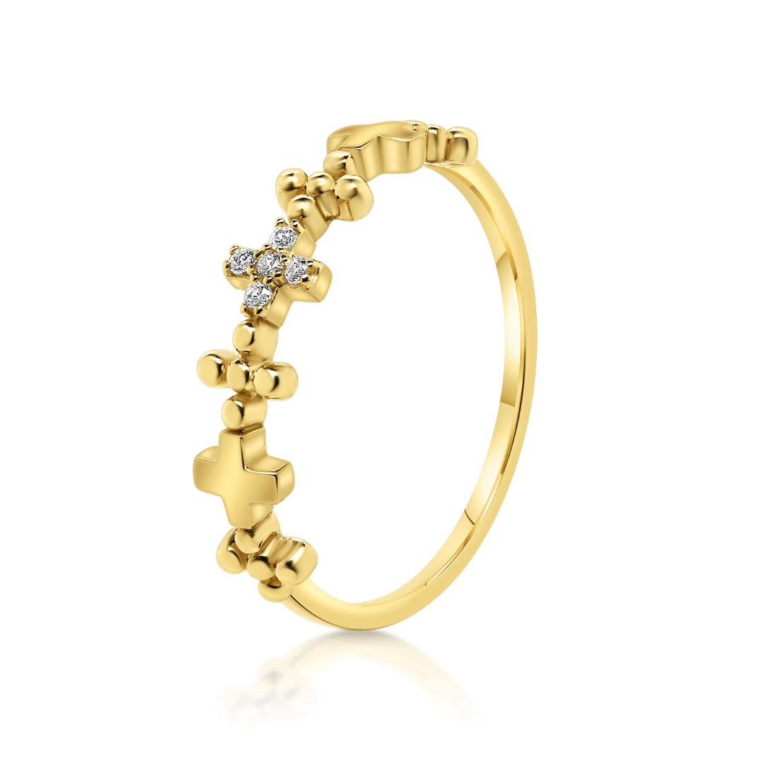 Inel din aur galben de 14K, cu diferite tipuri de elemente și pietre Cubic Zirconia albe.